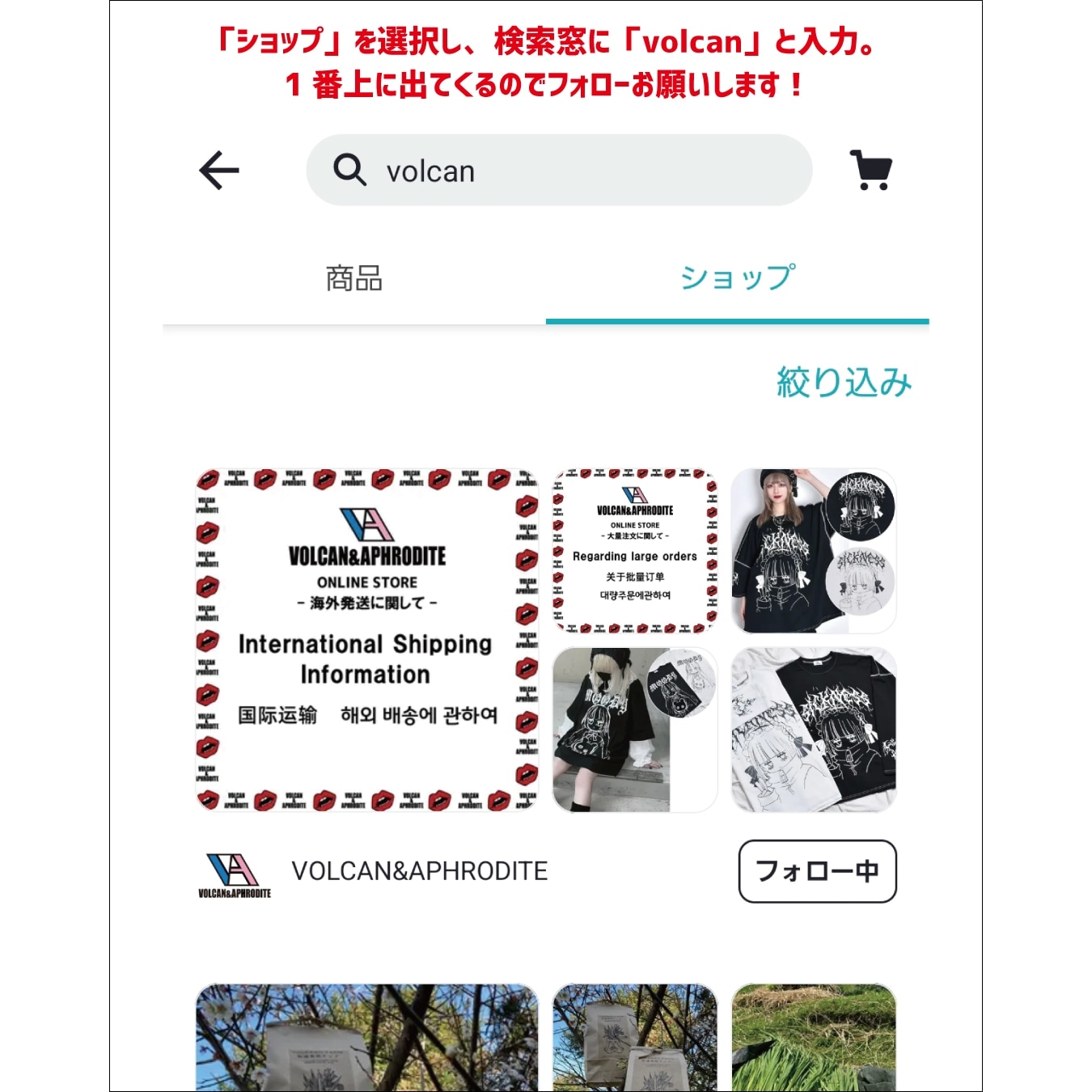 🔍上部のタブで「ショップ」を選択し、検索窓に「 volcan 」と入力すると1番上に出てくるのでフォローお願いします!