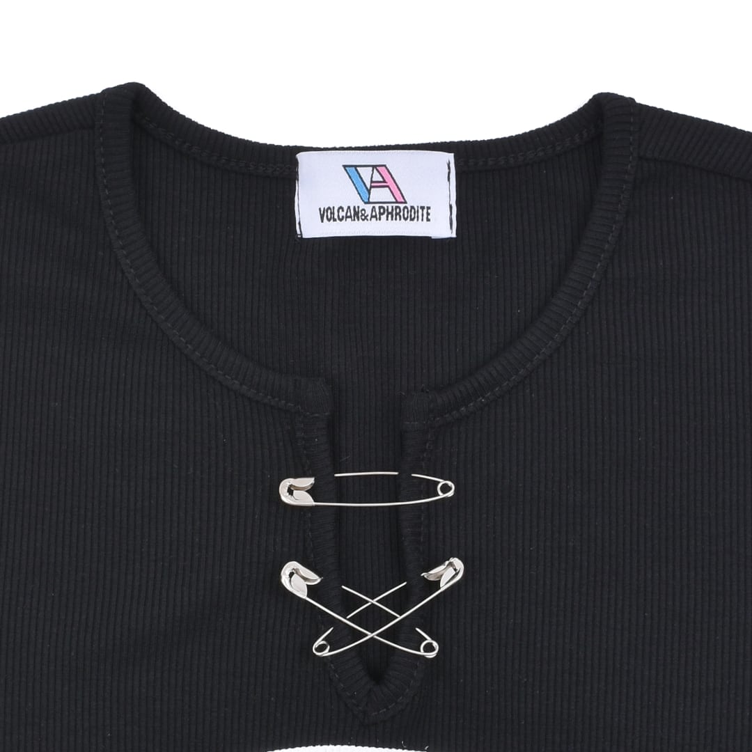 ネックのスリットに装着できる安全PINがアクセント
