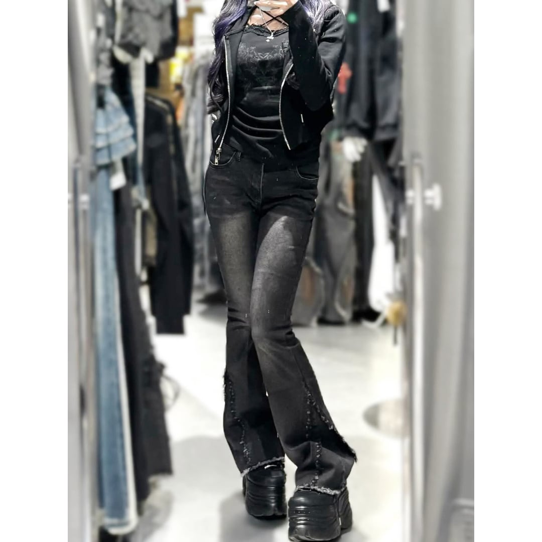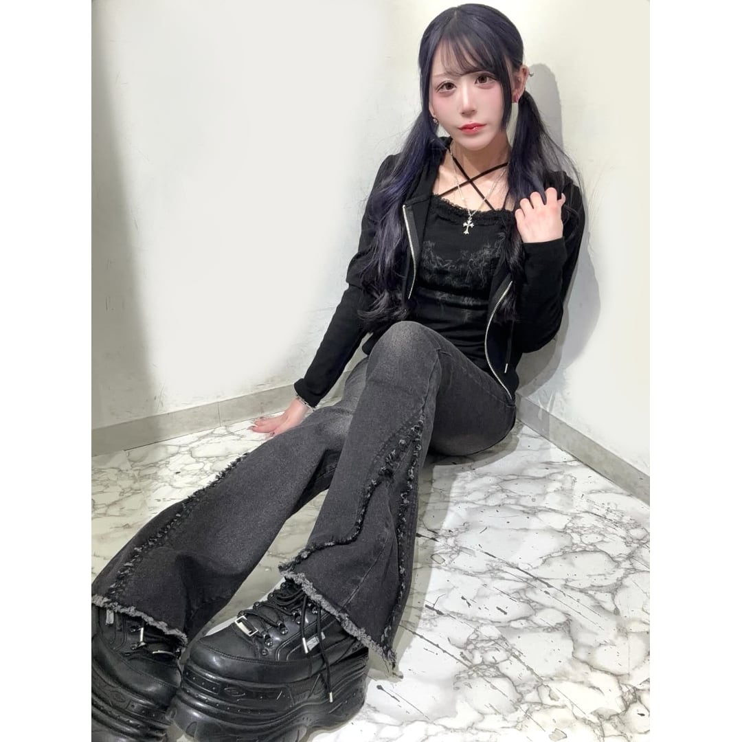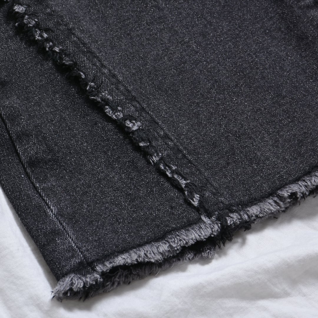 ヘムラインに施したフリンジデザインがアクセントになったデニムパンツ