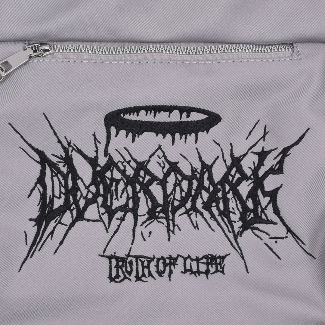フロントのロゴ、チェーンやベルトの装飾品がアクセント