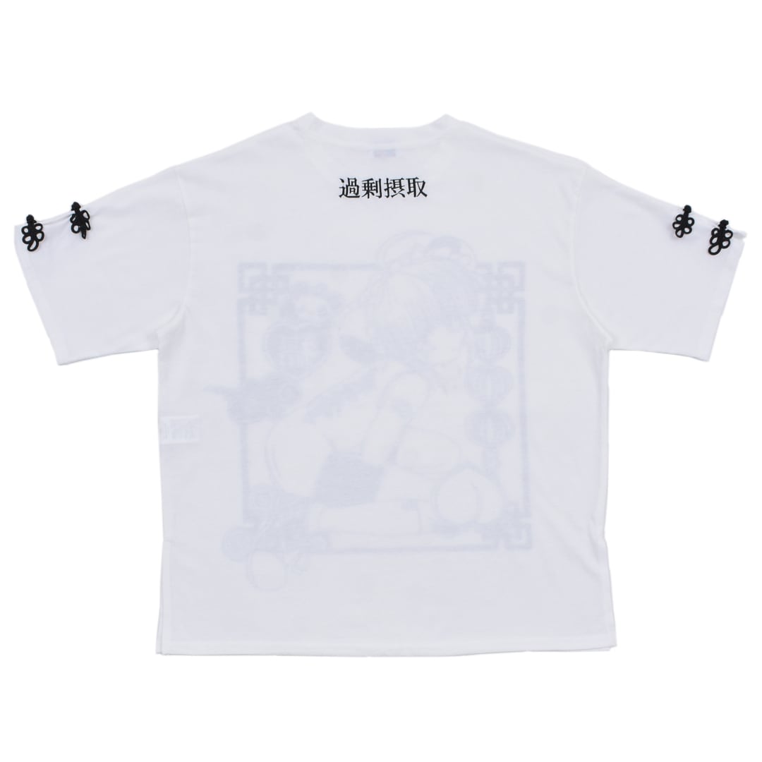 散りばめたチャイナモチーフのイラスト・バックの「過剰摂取」のメッセージロゴが印象的。