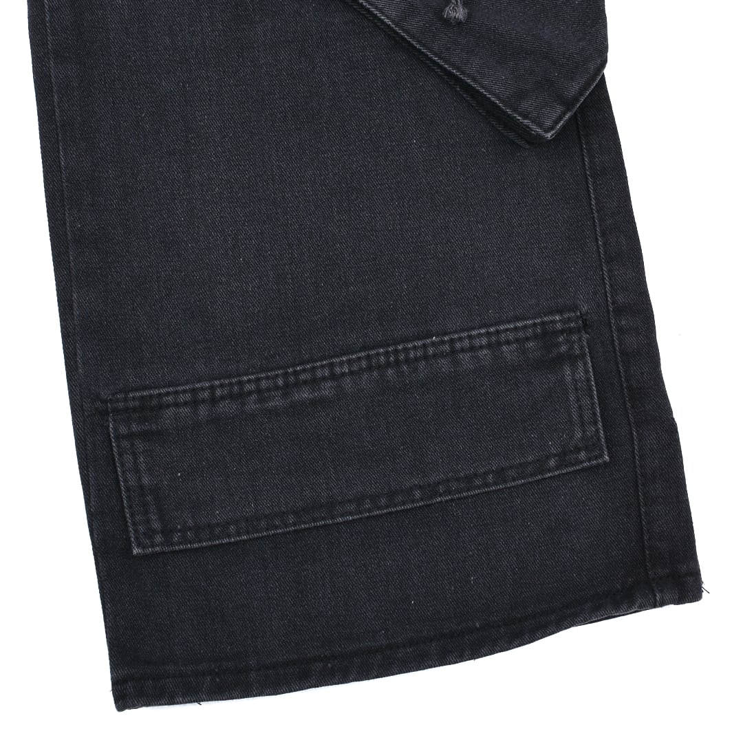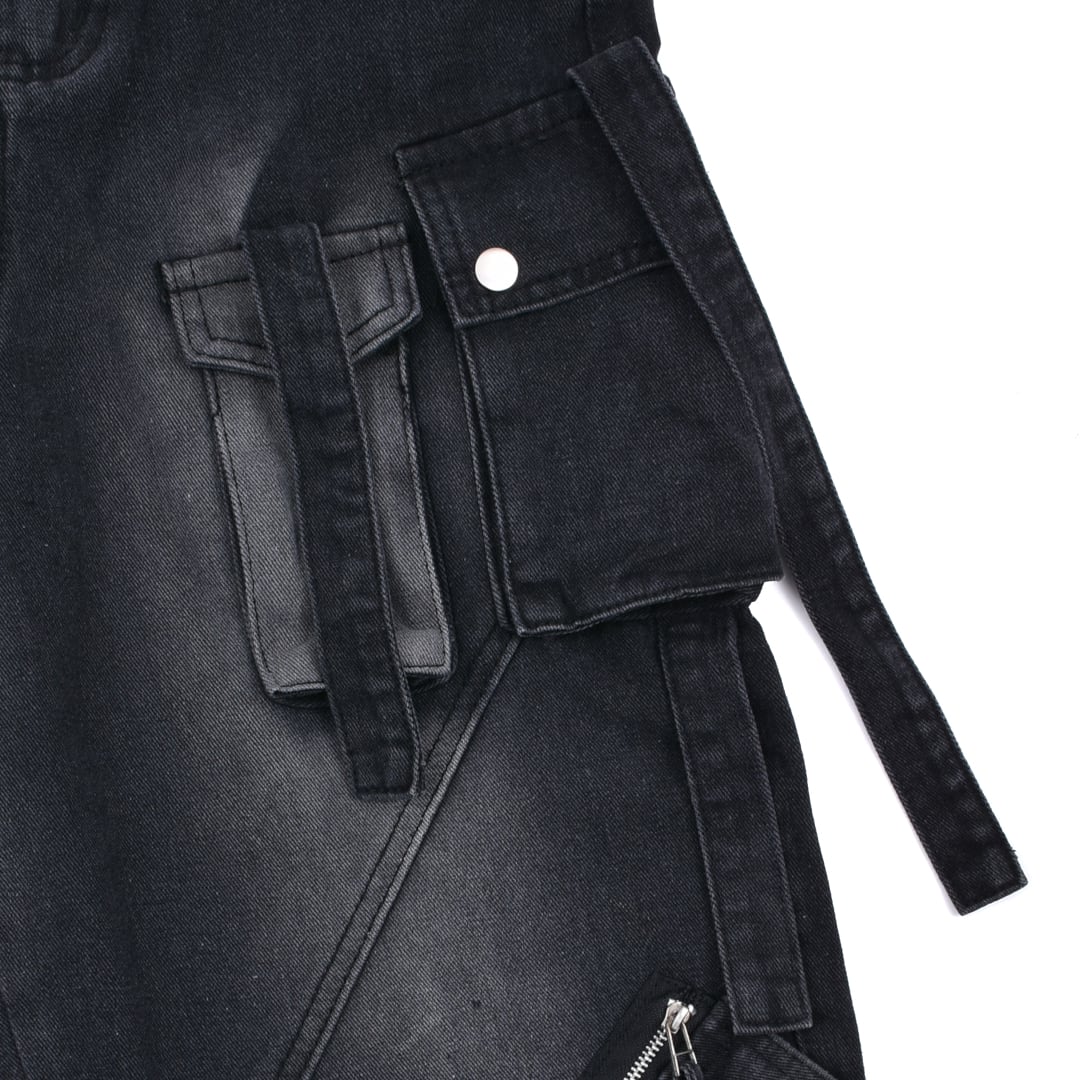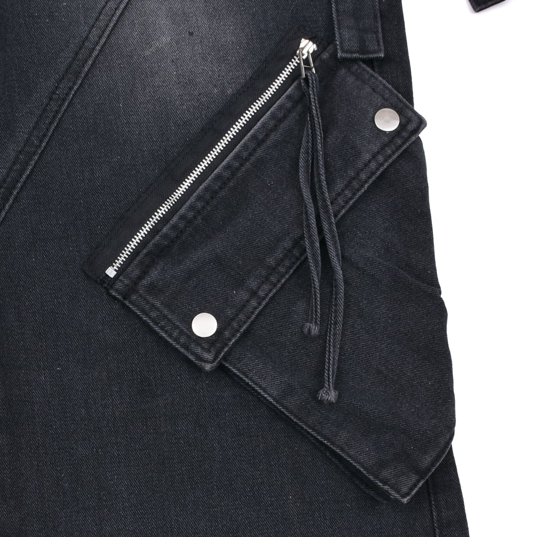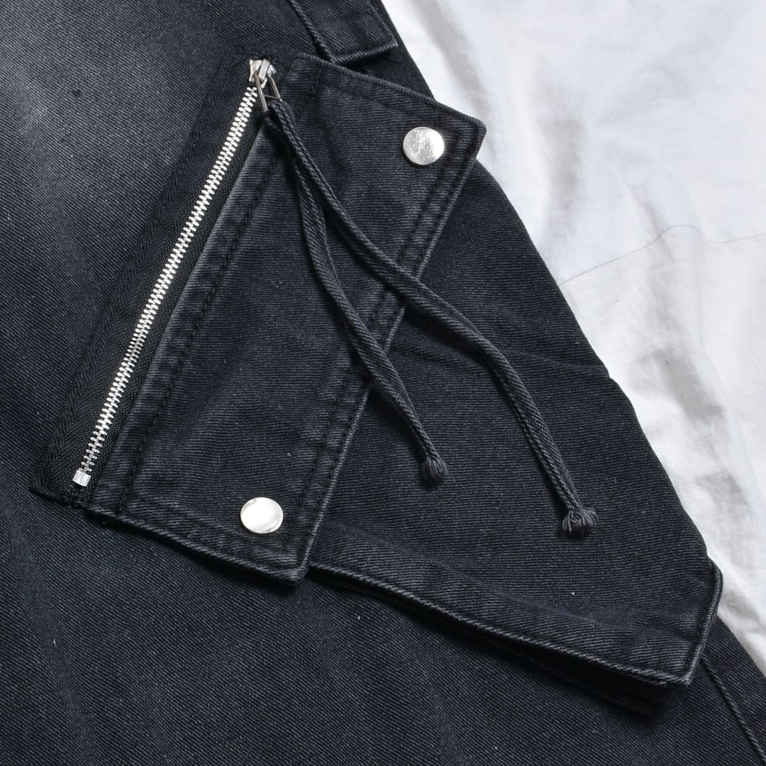 コード(紐)やZIP、大ぶりのポケットがアクセントになったブラックデニムパンツ