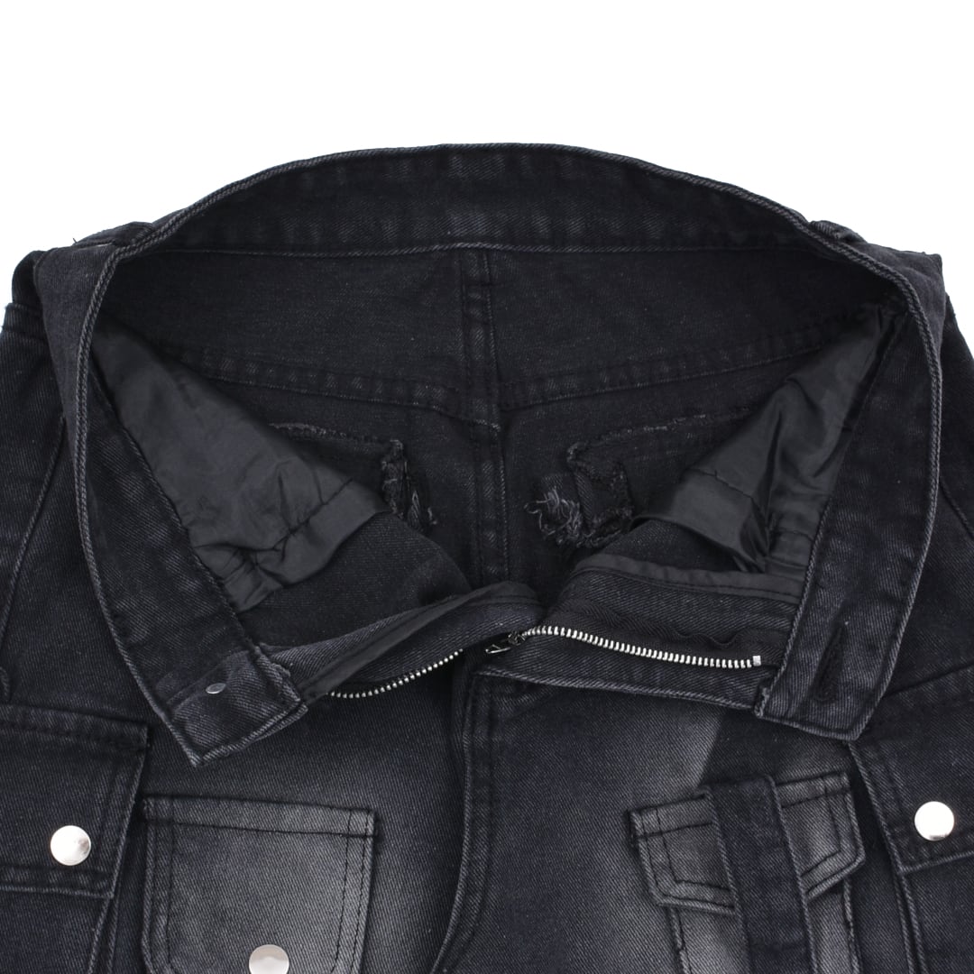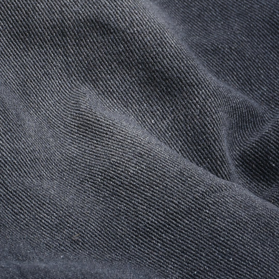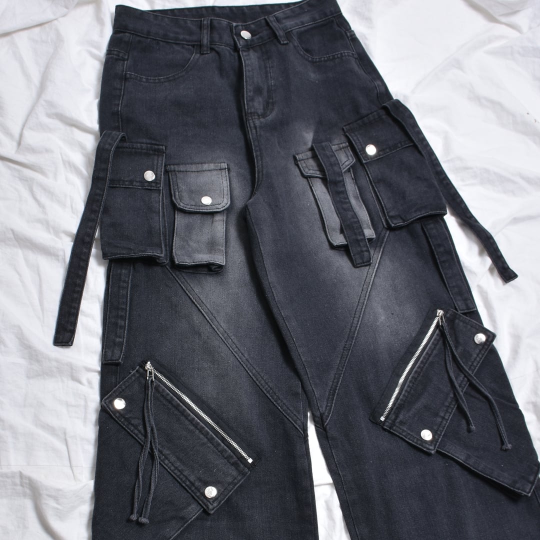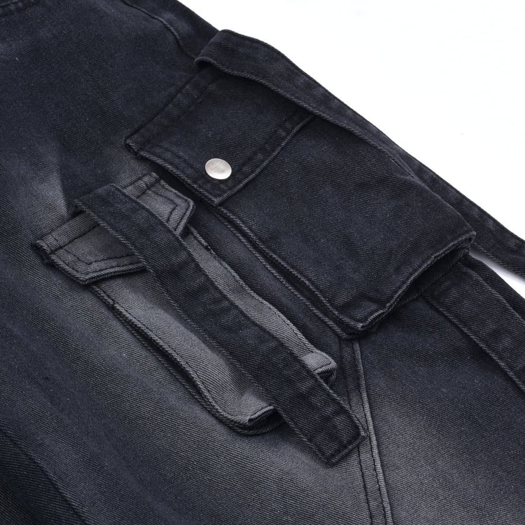 コード(紐)やZIP、大ぶりのポケットがアクセントになったブラックデニムパンツ