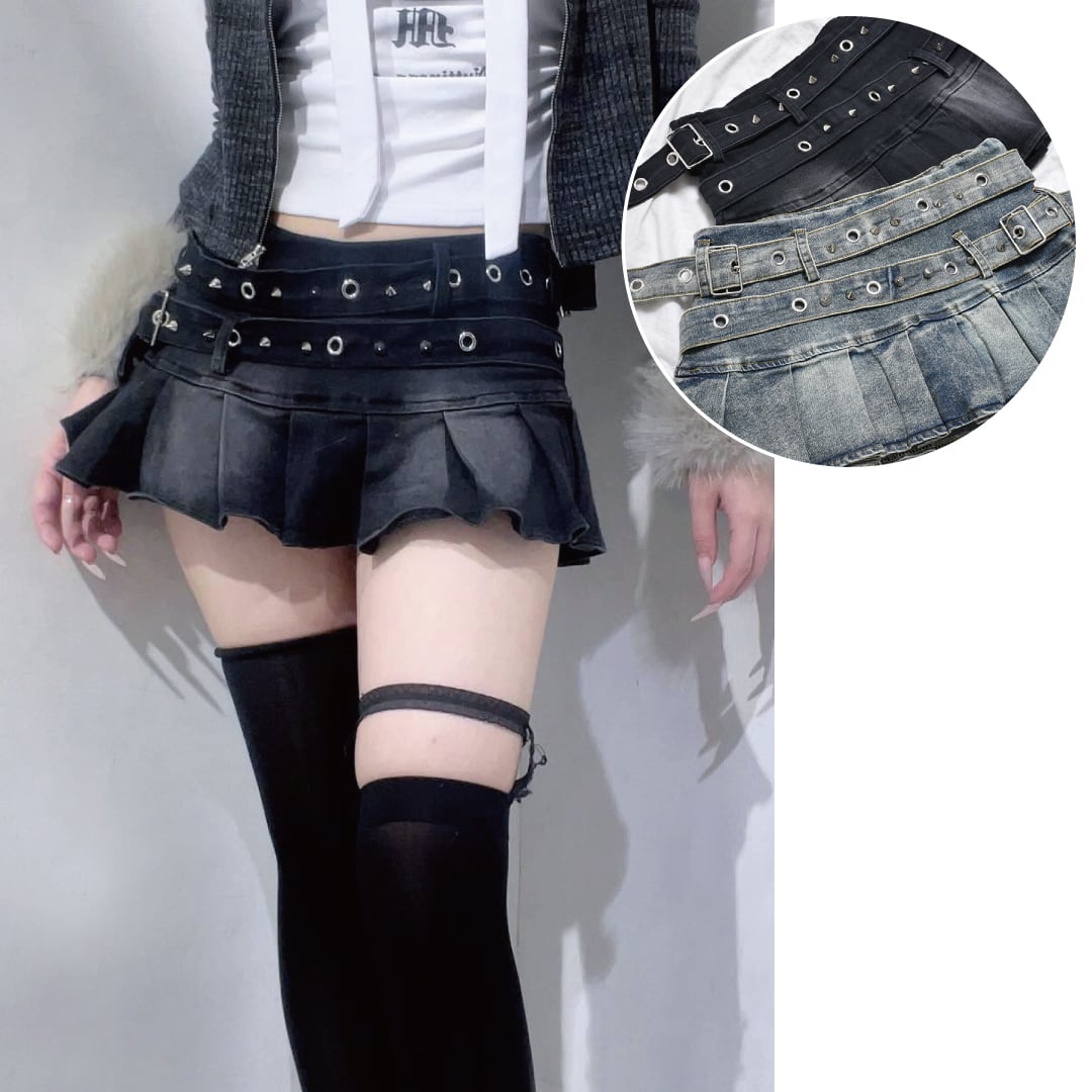 【10/20新着】2スタッズベルト★デニムプリーツミニスカート