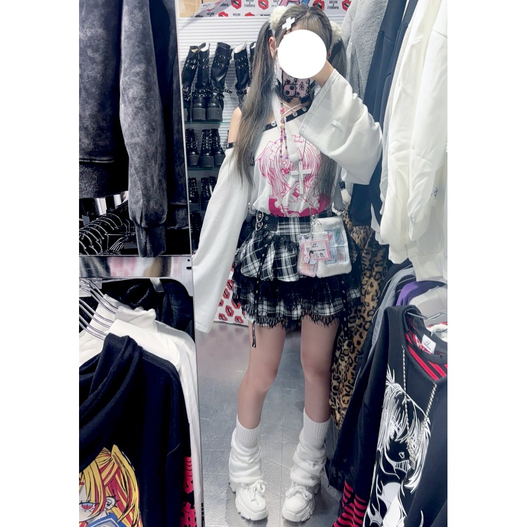 レースやレザー、メタルパーツの装飾がアクセントになったチェック柄ミニスカート