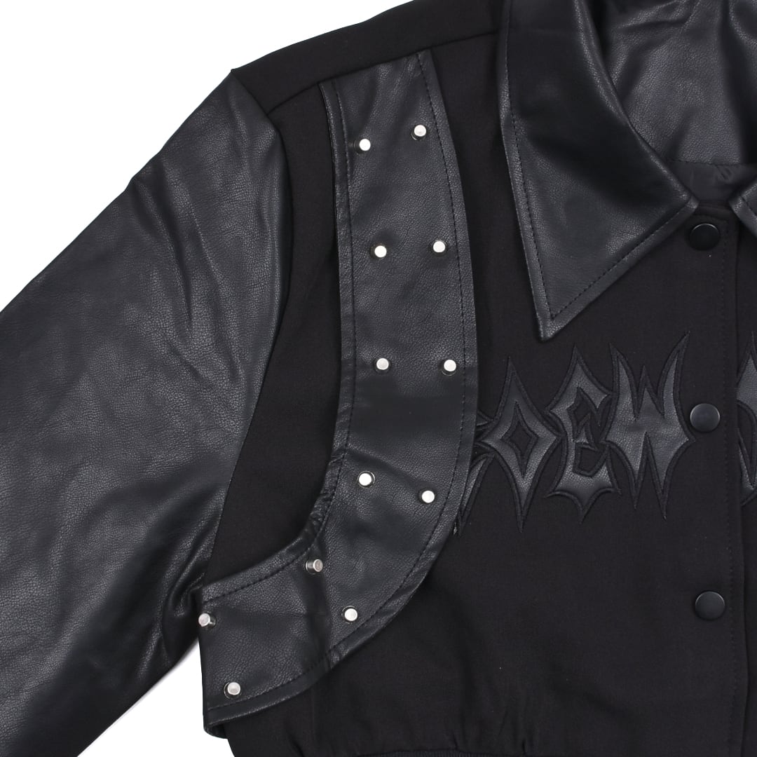 刺繍、スタッズ、フェイクレザーの切り替えデザインがアクセント
