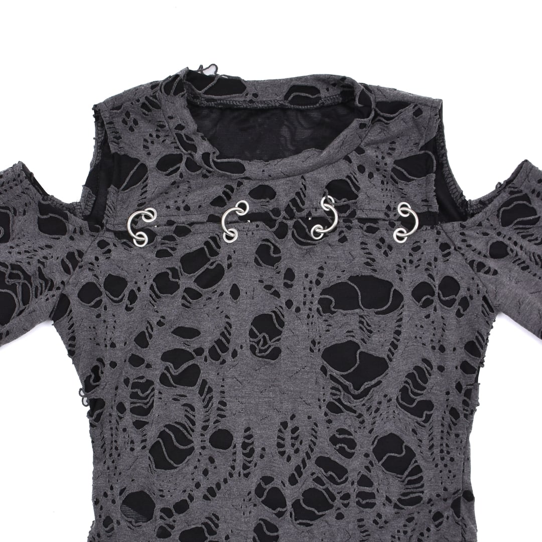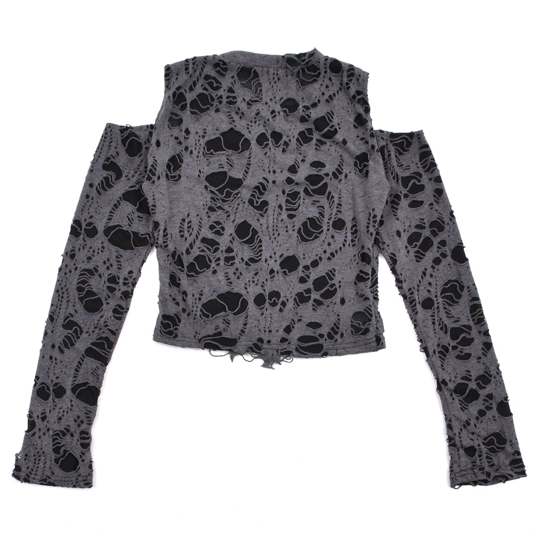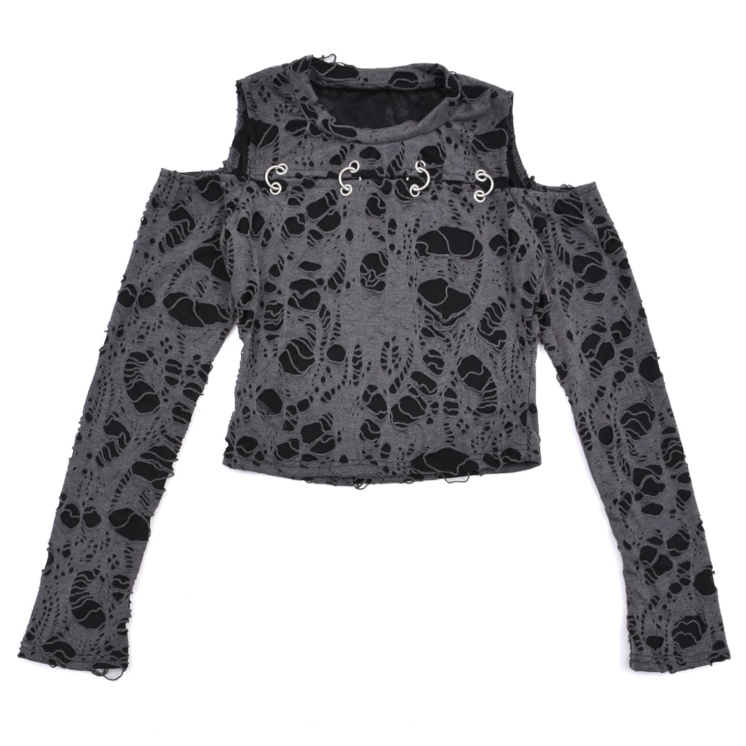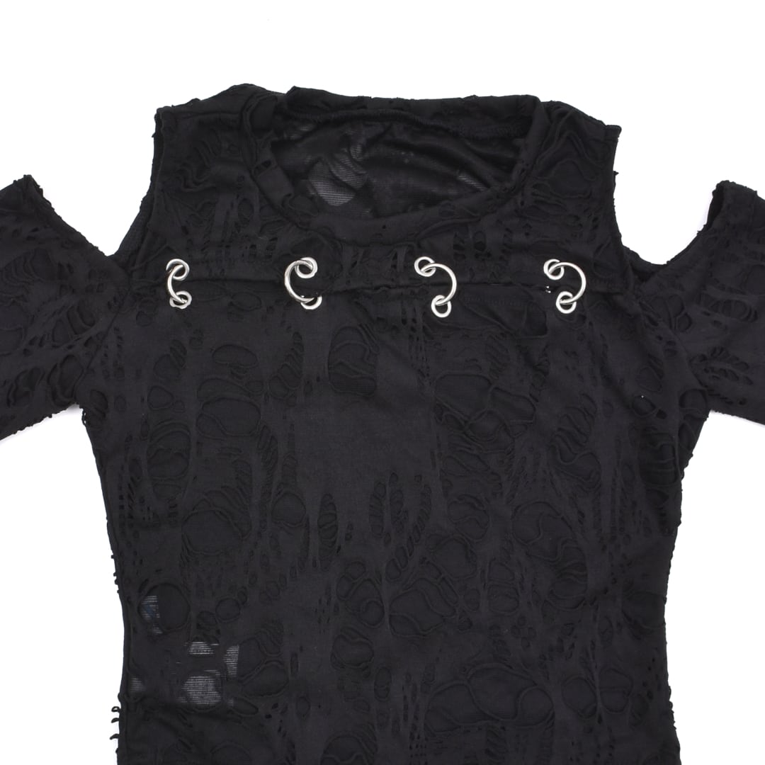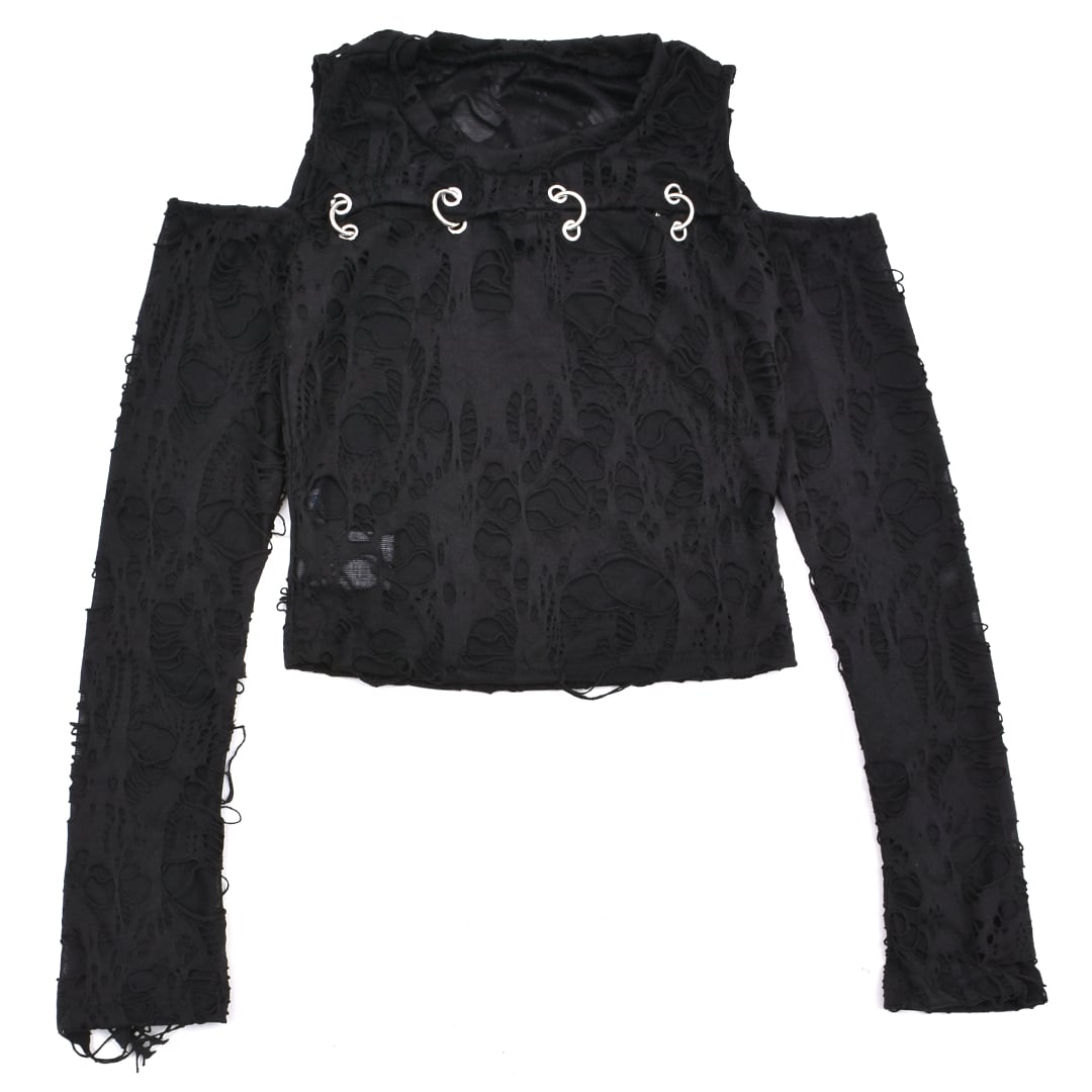 激しいダメージ加工を施した生地、ピアスデザインがアクセントになったロンT