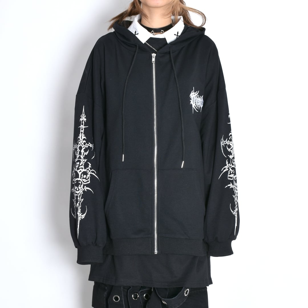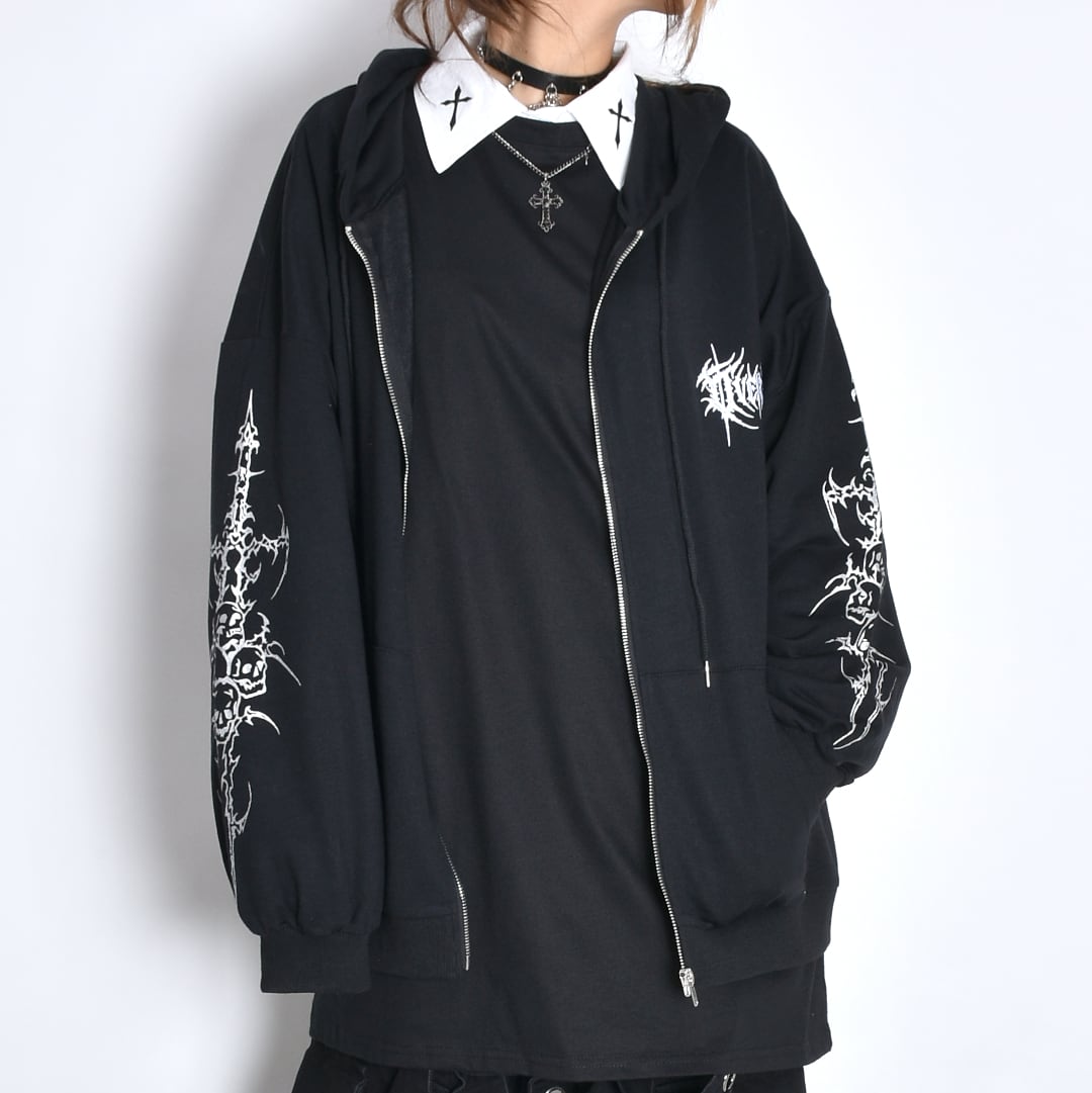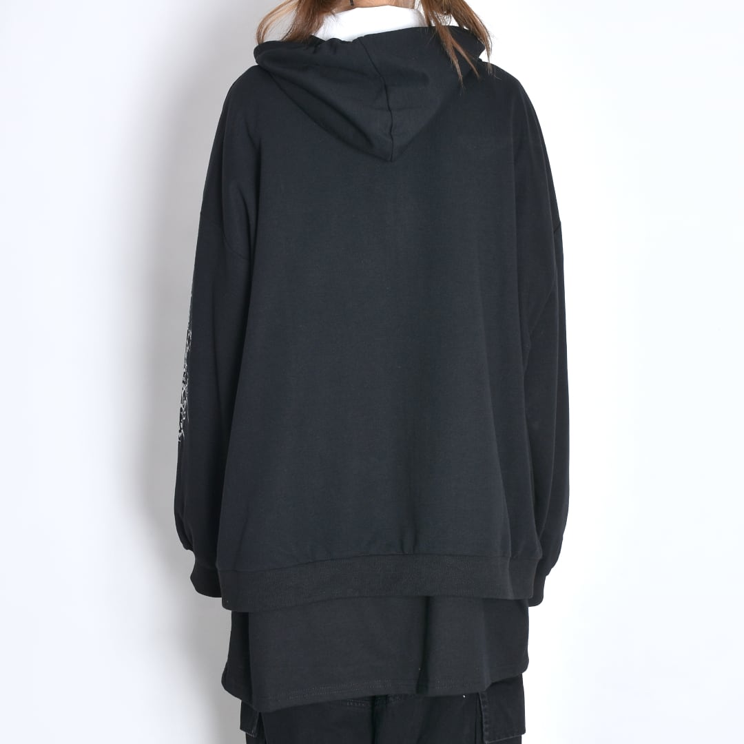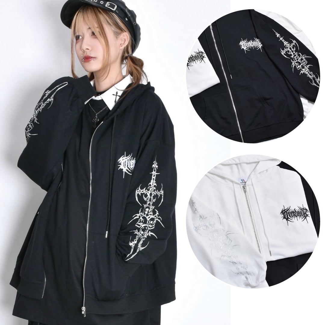 胸元の刺繍、袖のメタリックなロゴがアクセント