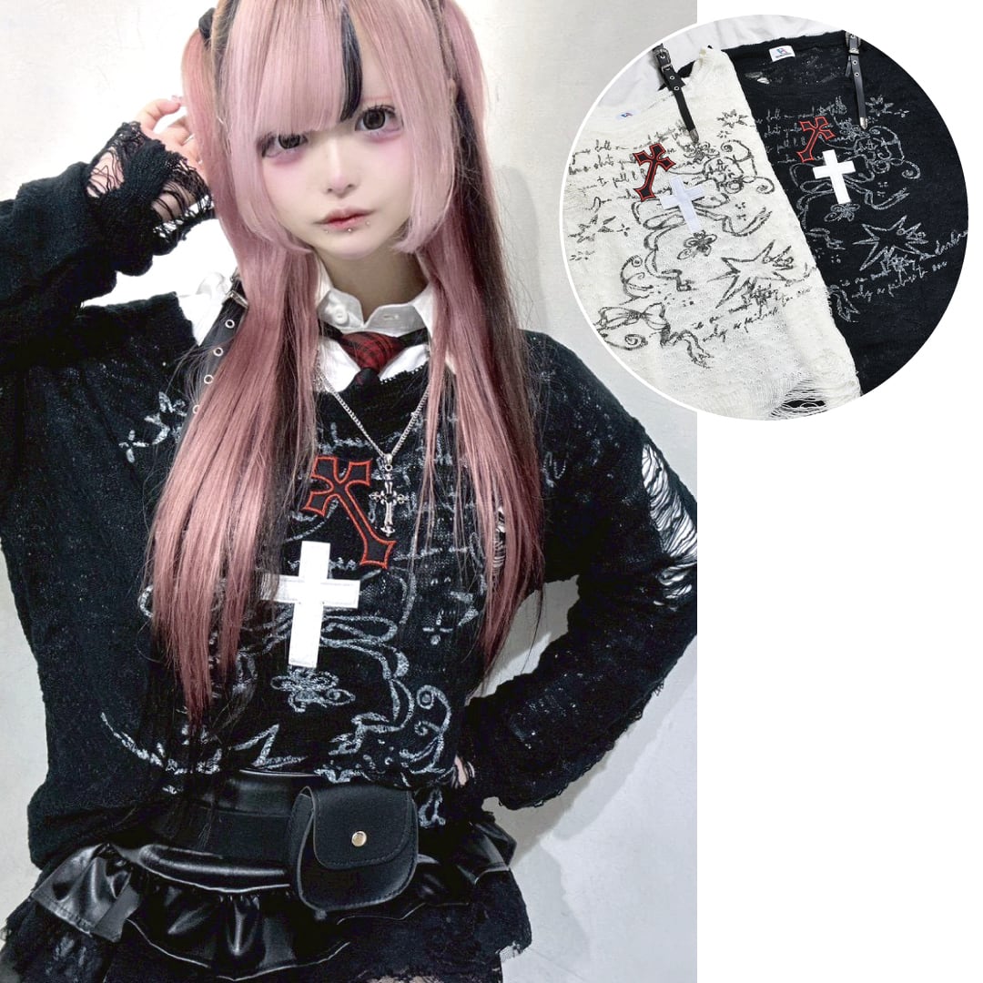 【10/31 完売BLACK再入荷!】新作★肩ベルトREDクロスダメージトップス