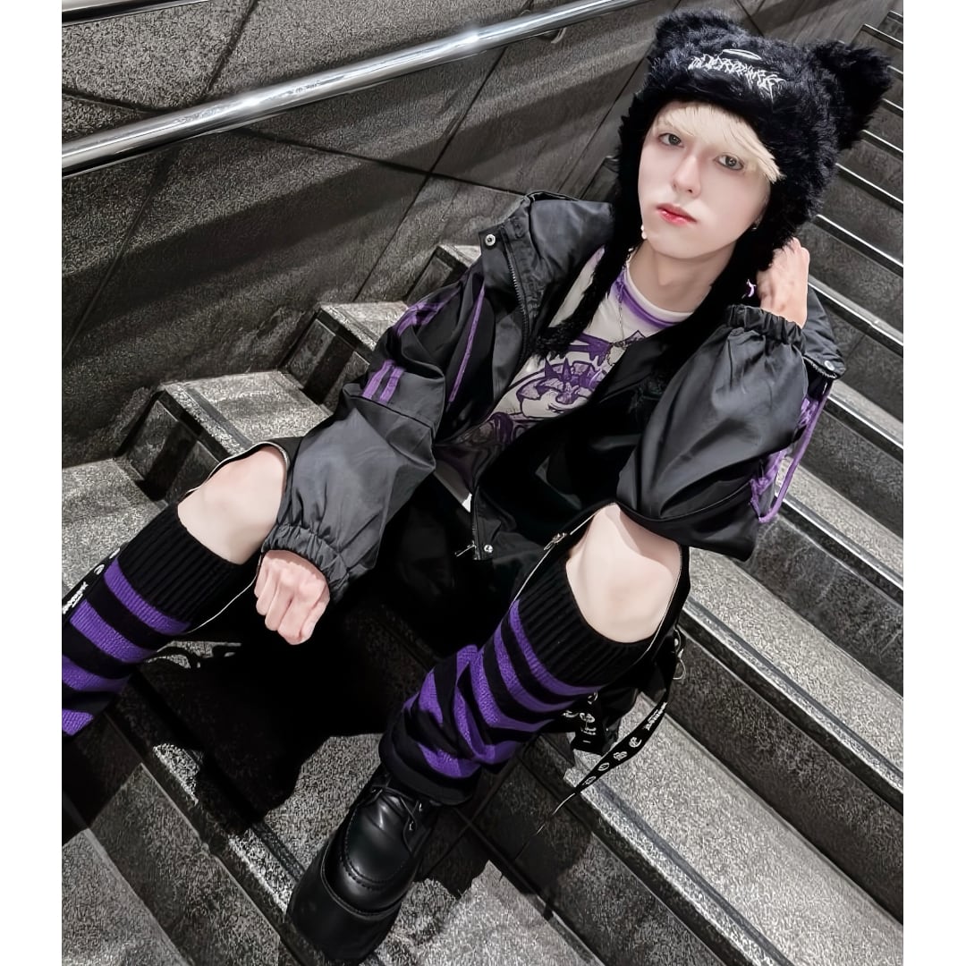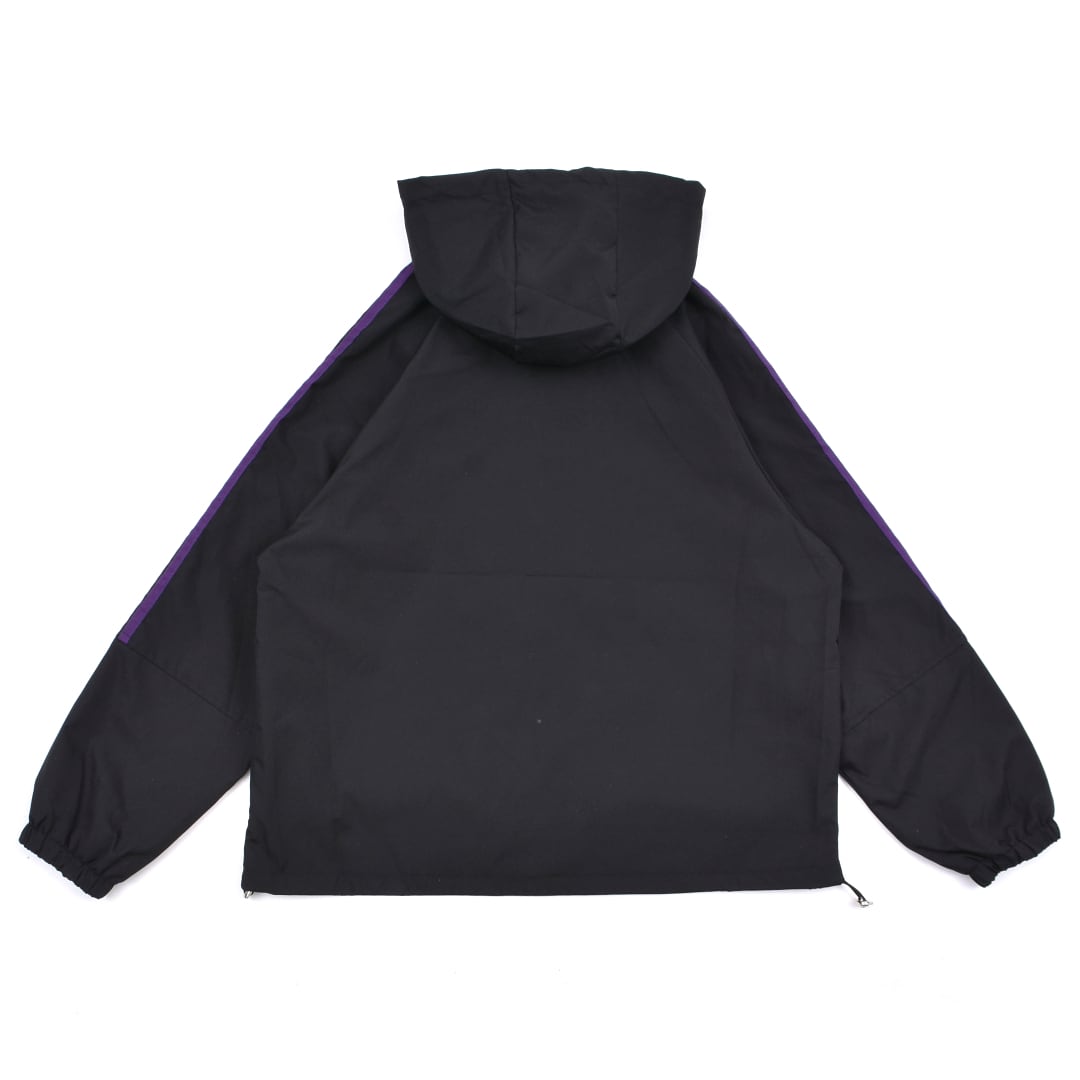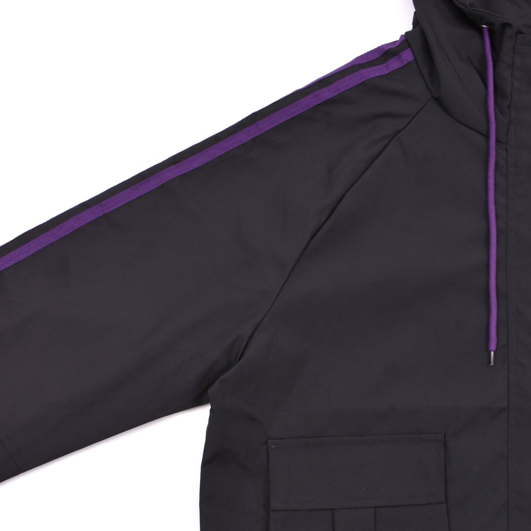 フードのスピンドルや袖の2ラインなど、散りばめたパープルカラーが◎