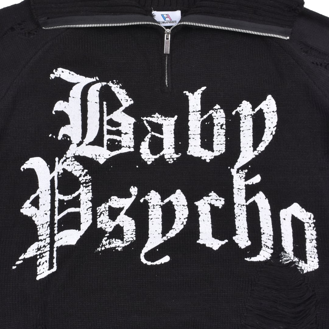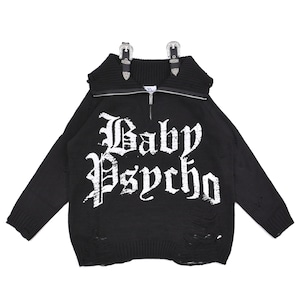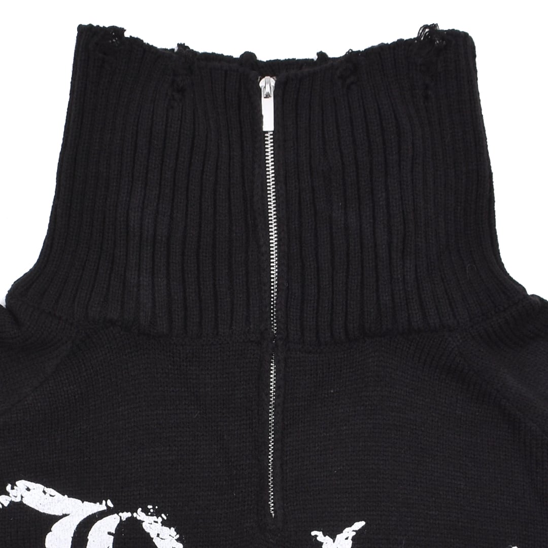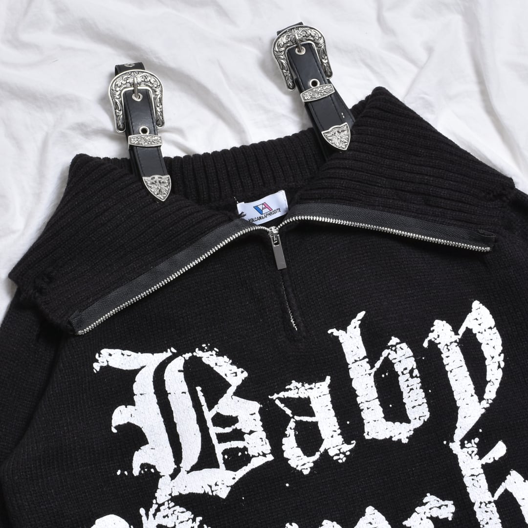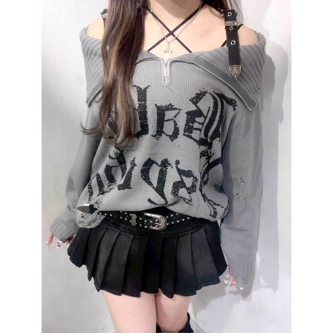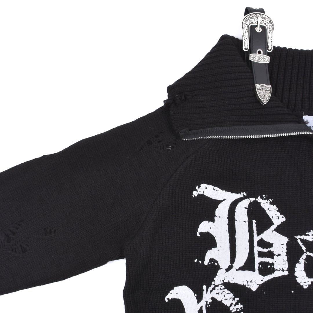 ネック部分の折り返しやZIPデザイン、ショルダーベルトがポイントになった変形ニット