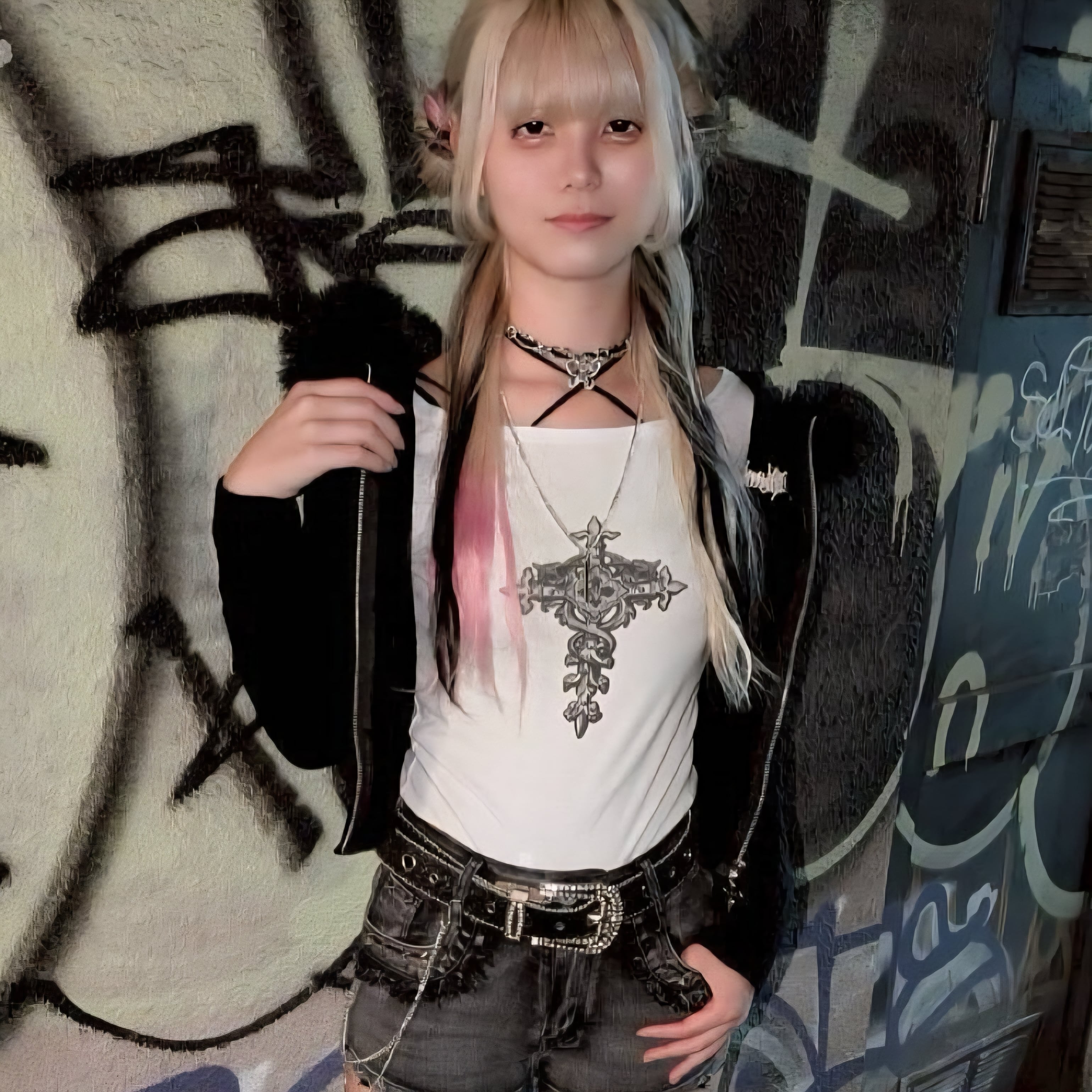 胸元の刺繍、クロスのZIPファスナーもポイント