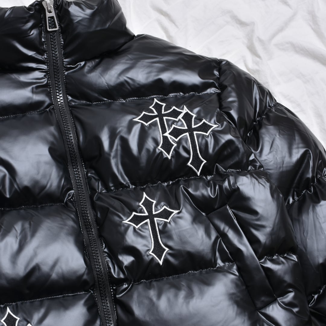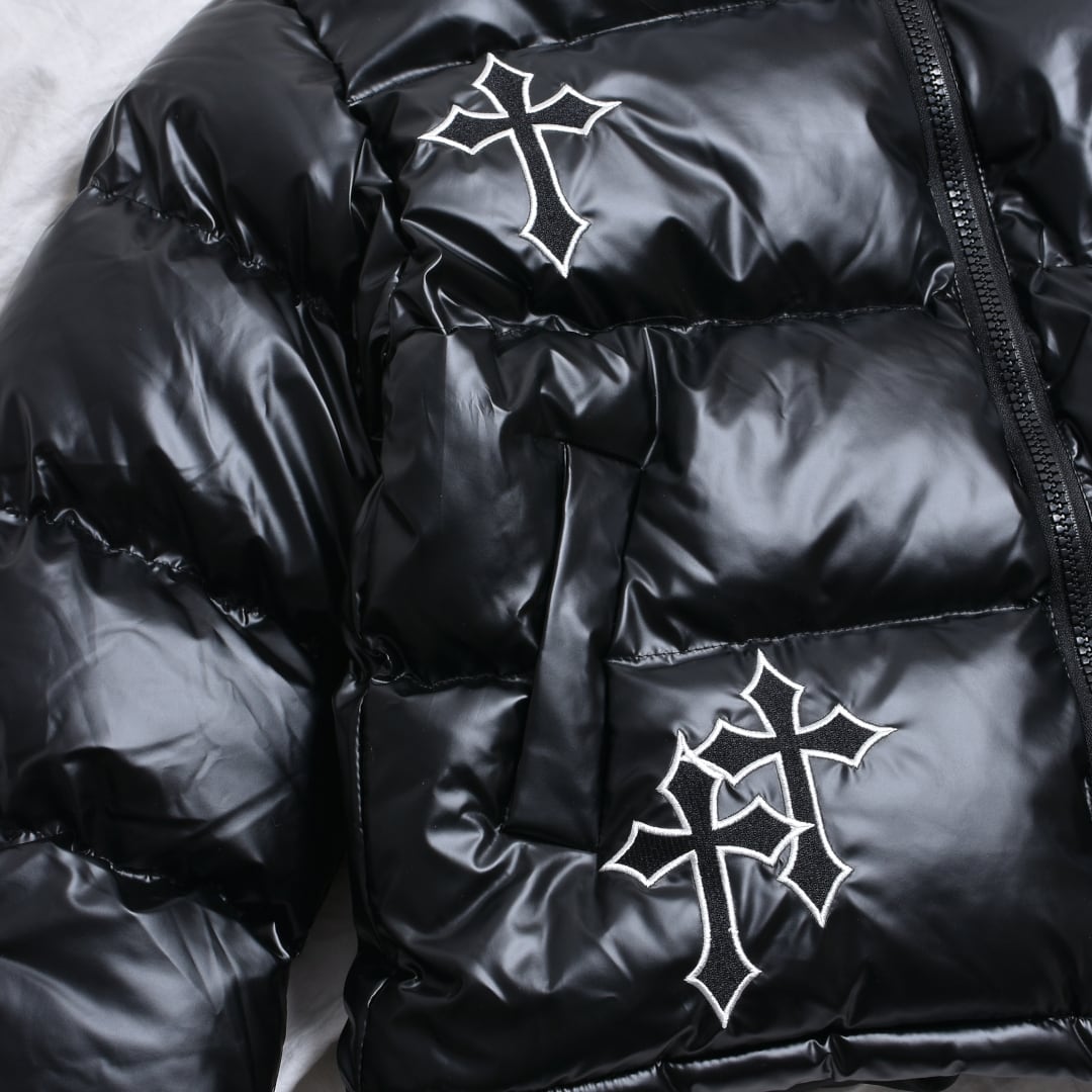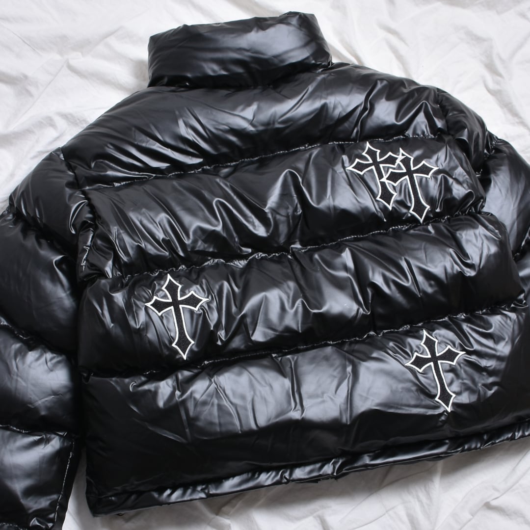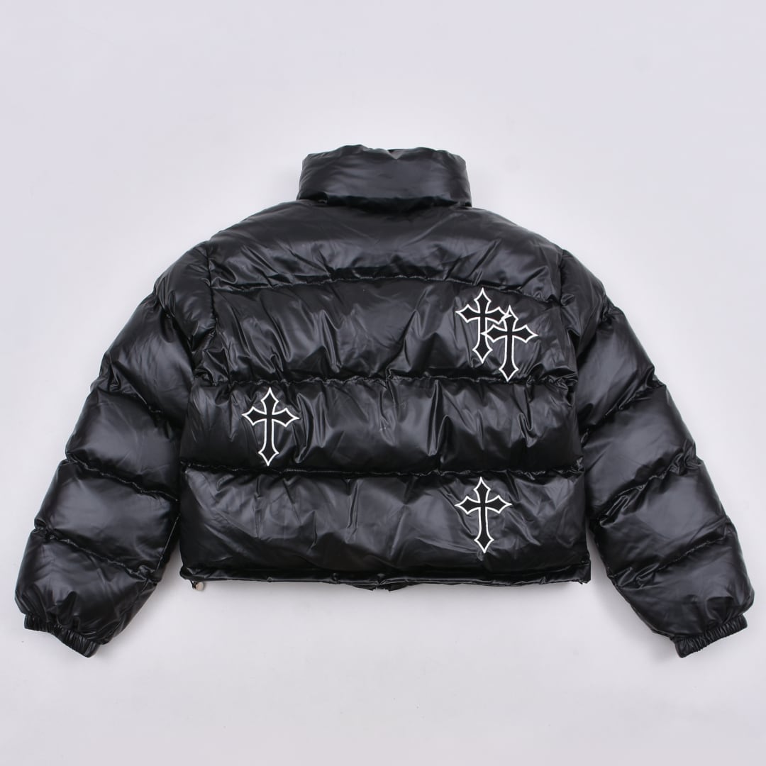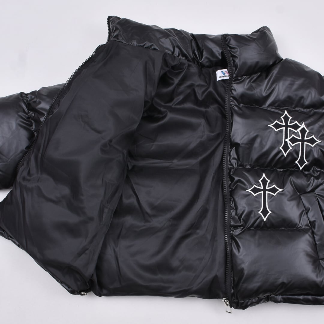 随所に施したクロスモチーフの刺繍がアクセントになった中綿ジャケット