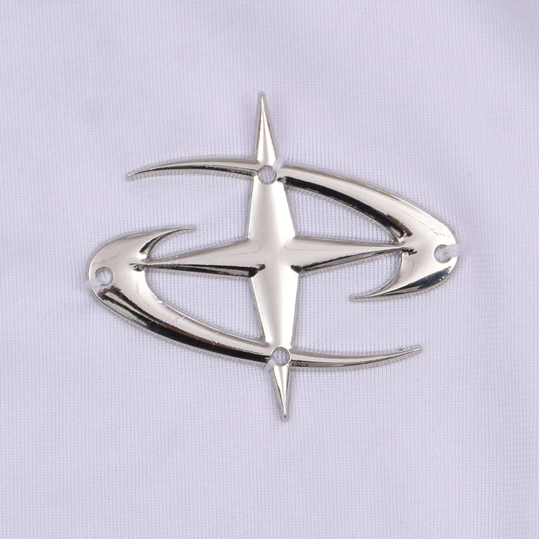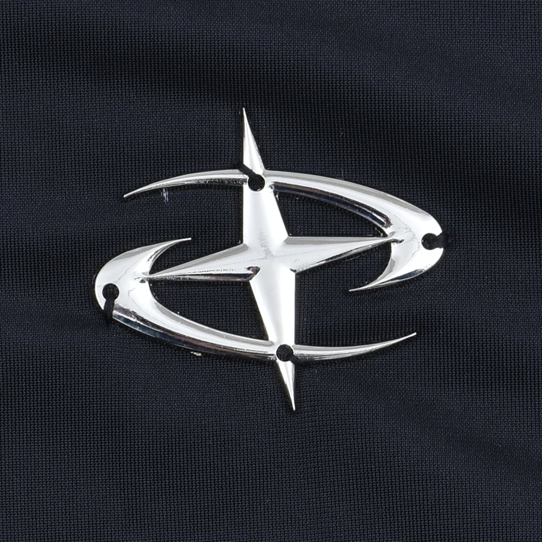 胸元のメタルパーツ、パイピングデザインがアクセント