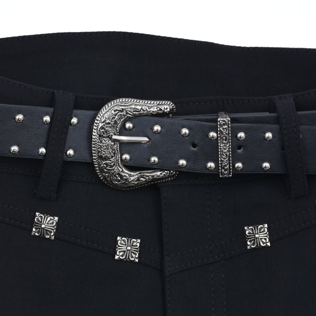 ゴシック調の模様を施したスタッズ、サイドのハトメデザインがアクセント