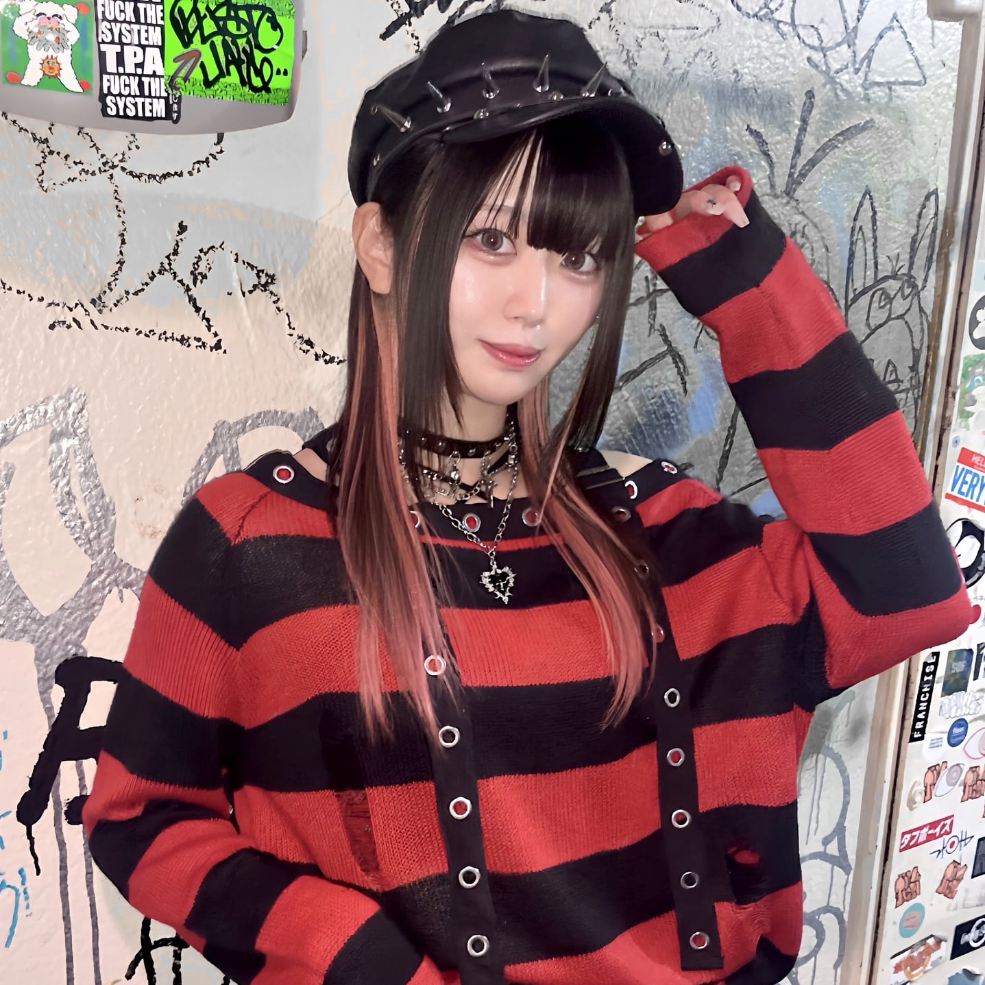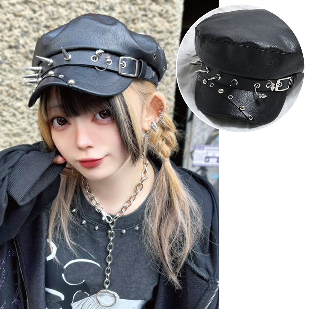 沢山のトゲ状のスタッズやハトメベルトなどを施したハードなデザインのキャップ