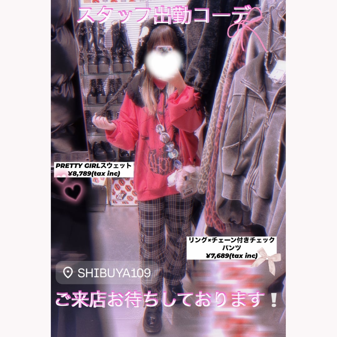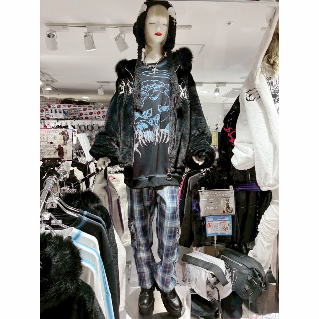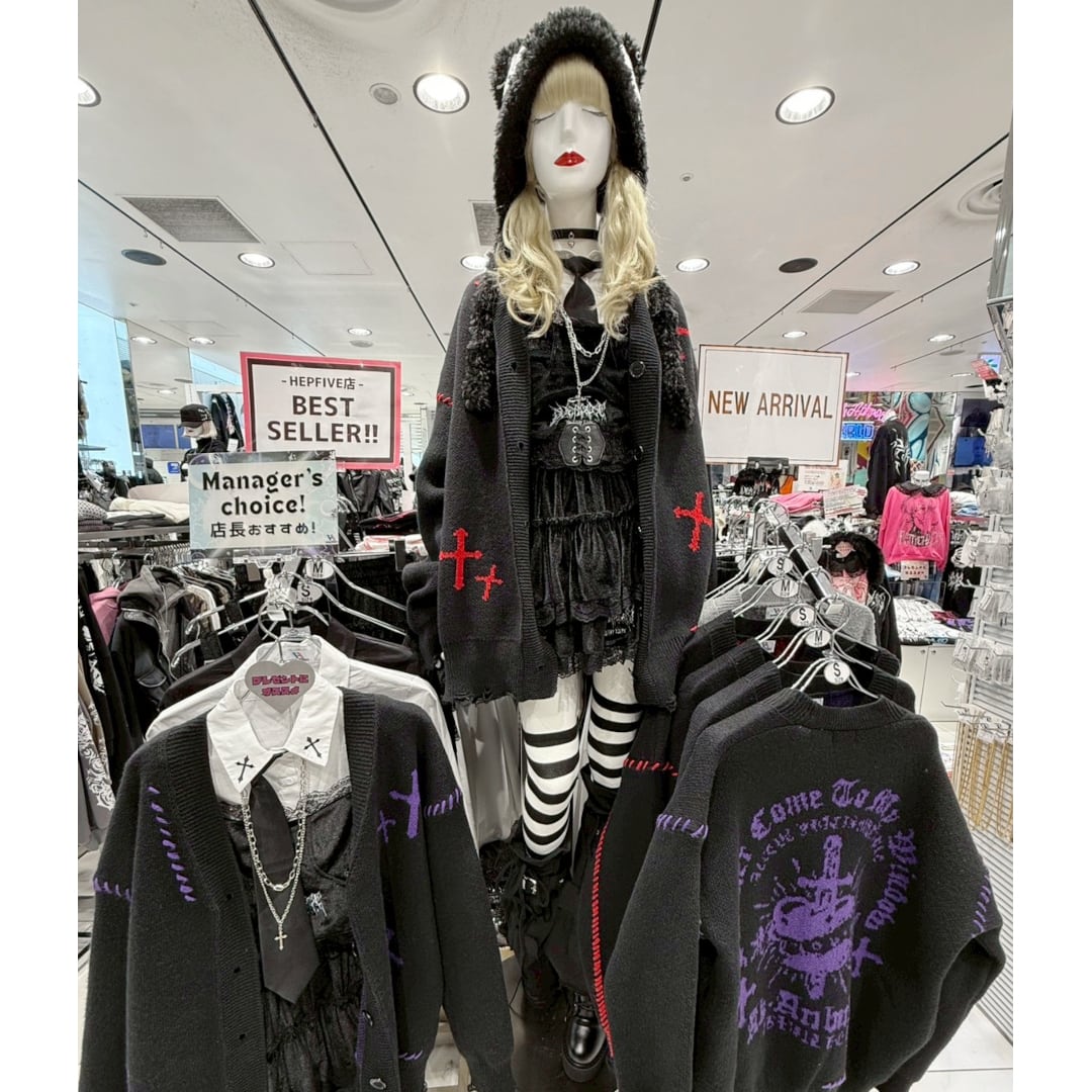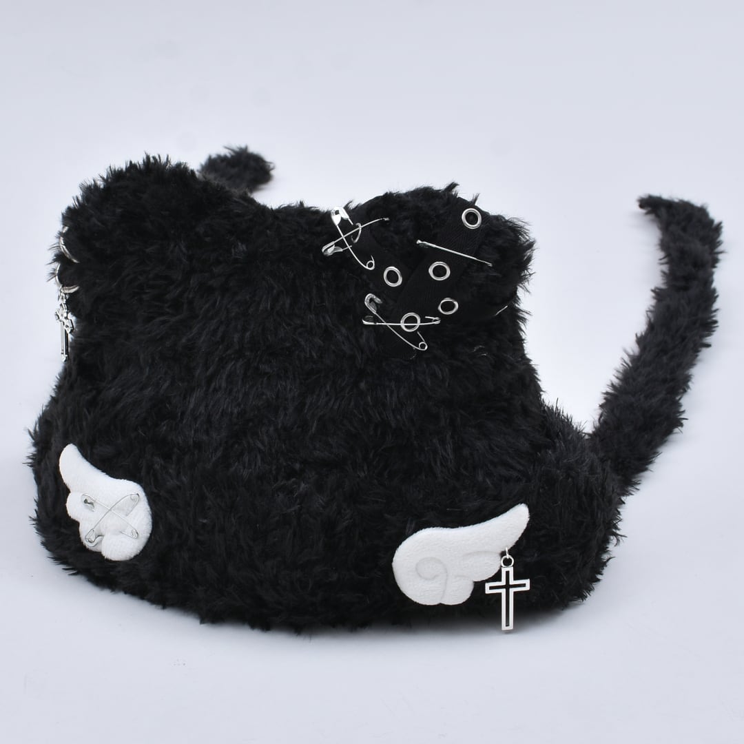 多数の安全ピンやクロスのチャーム、天使の羽をイメージしたモチーフが可愛い。