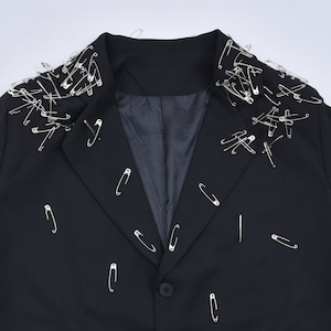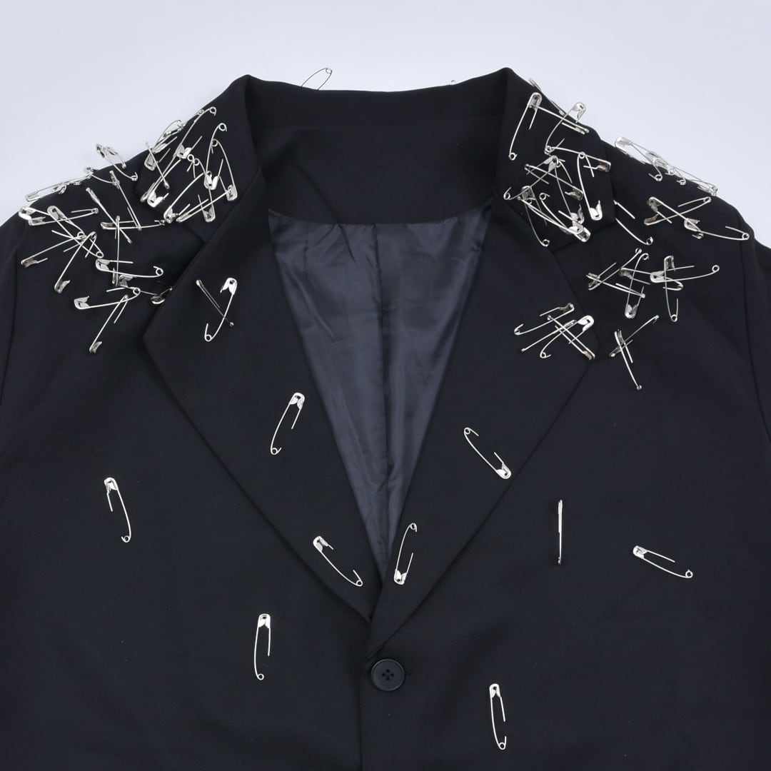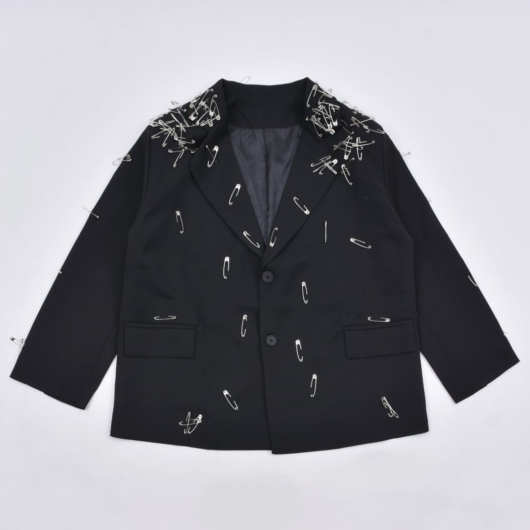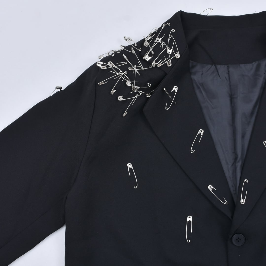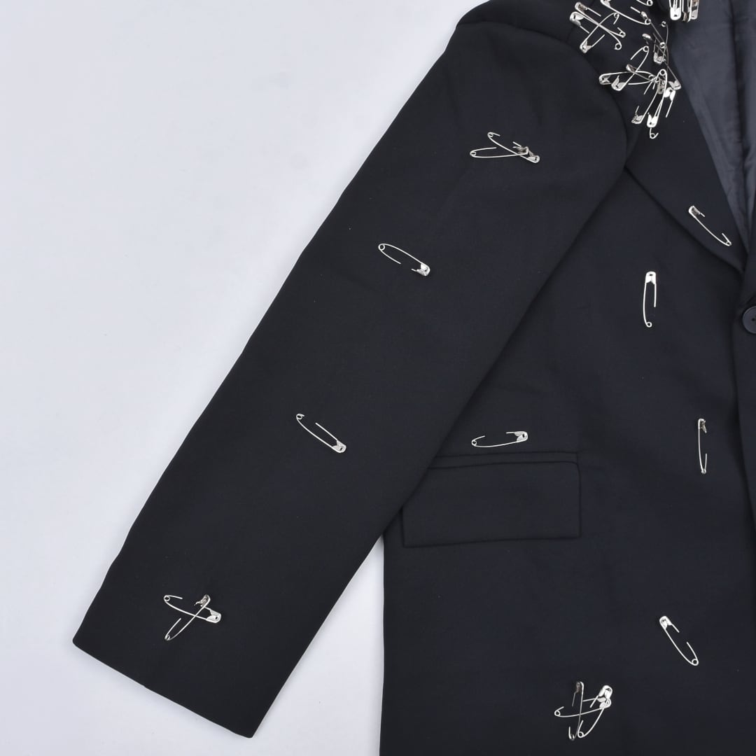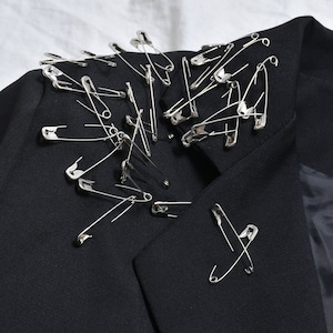 ランダムに配置された無数の安全ピンが思わず目を奪う一品。