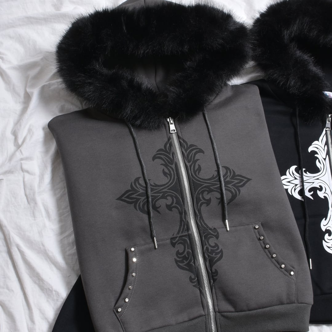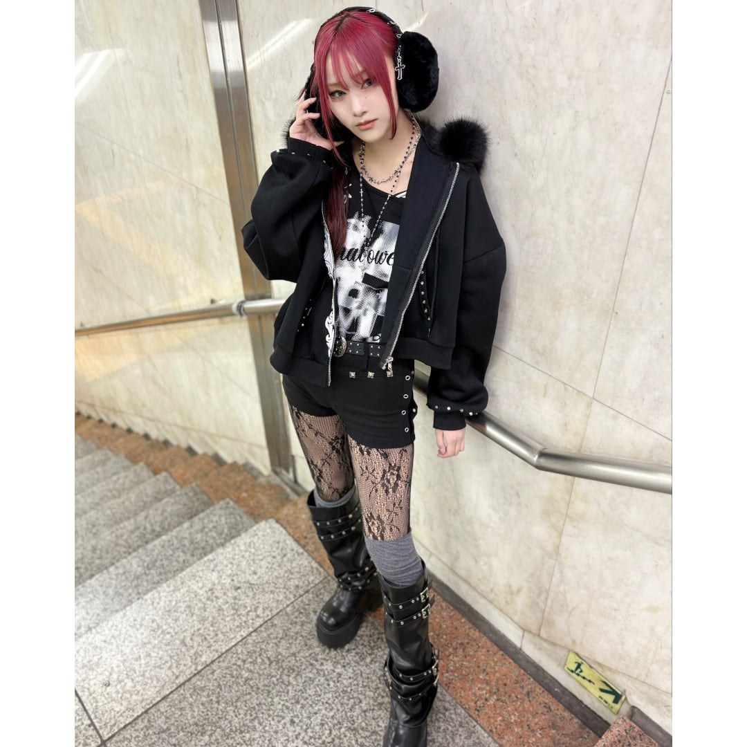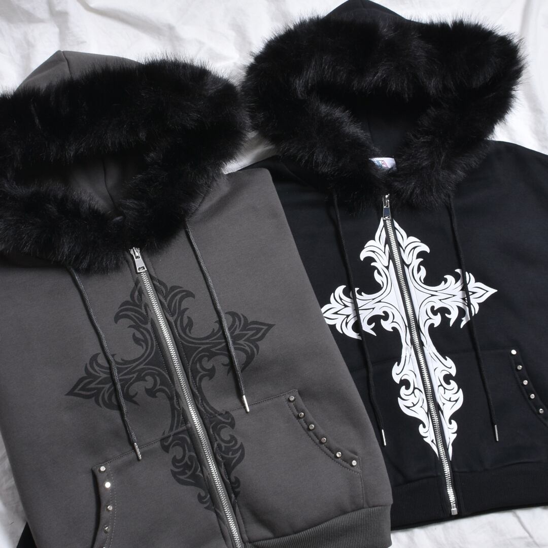 【1/3新着】ショート丈 クロススタッズファーZIPパーカー(裏起毛)