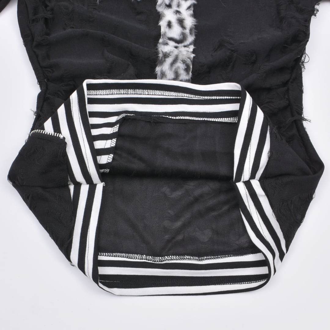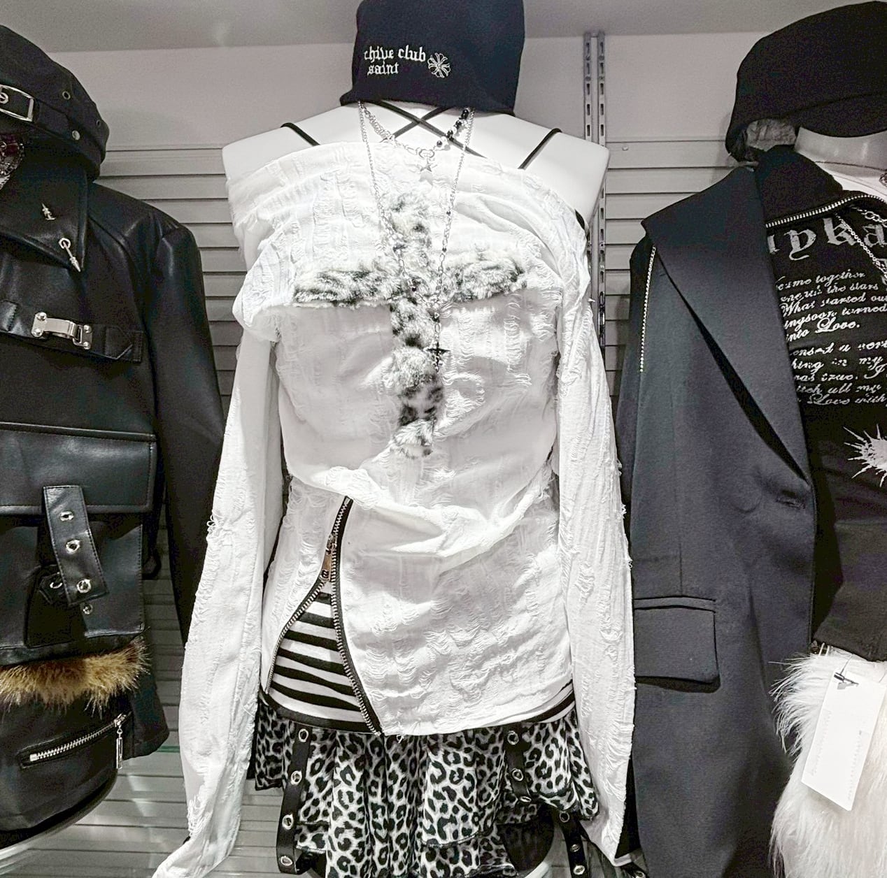 首元のドレープや裾のZIPデザインが個性的なアクセント