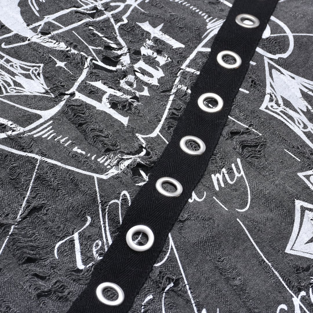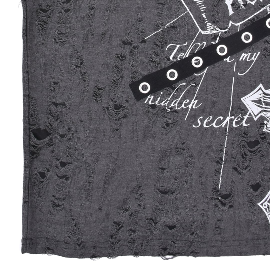 ショルダー部分のベルト、ハトメテープを施したフロントの幻想的なプリントがポイント