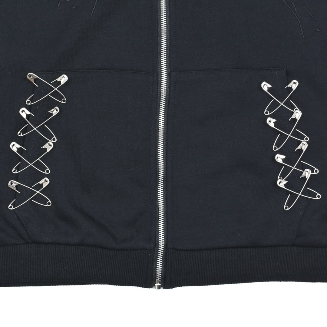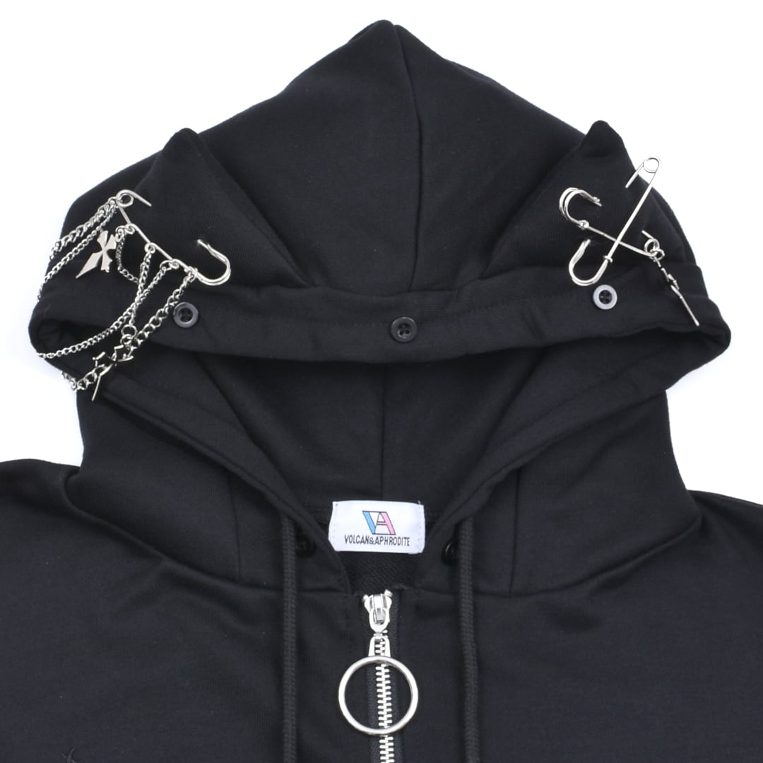 猫耳やポケットに付いた安全ピンがアクセント