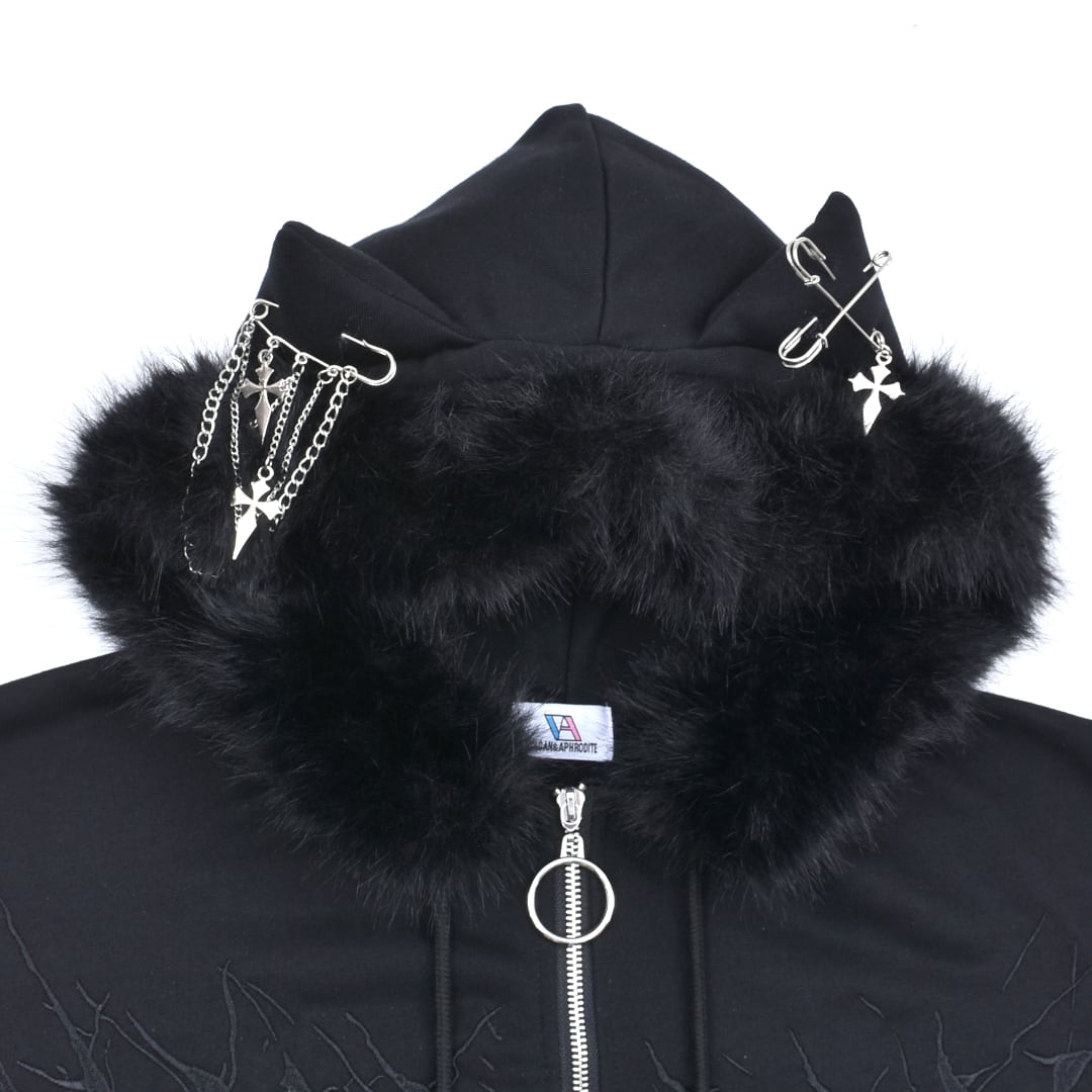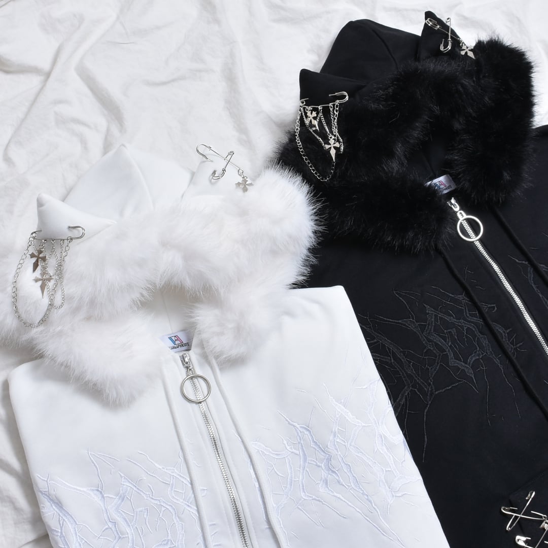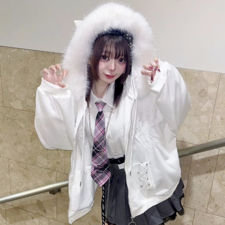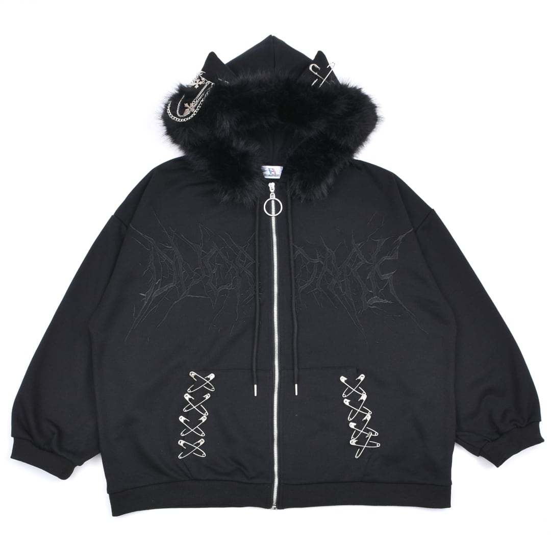 【2/20新着】サブカル刺繍★ネコ耳フードファーZIPパーカー