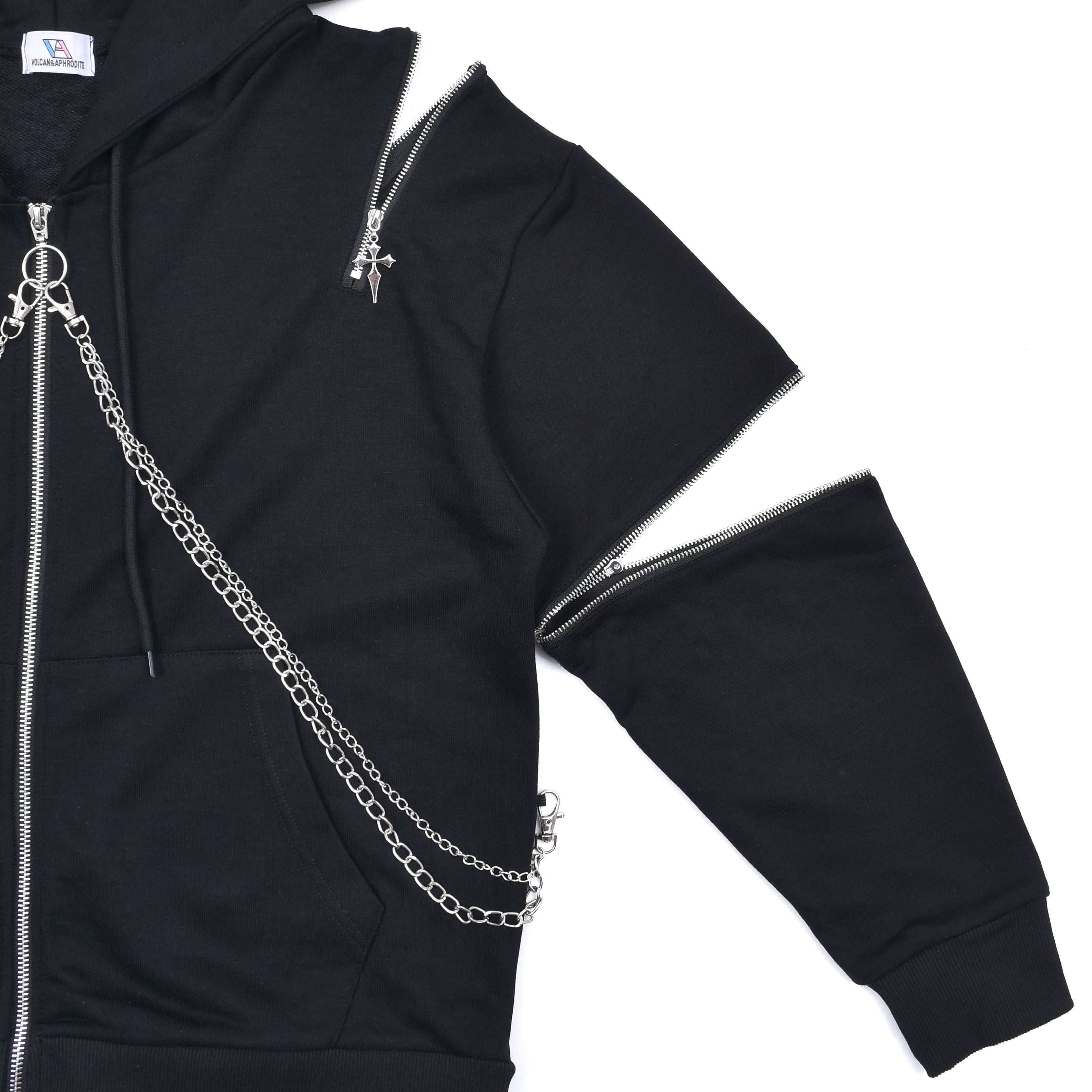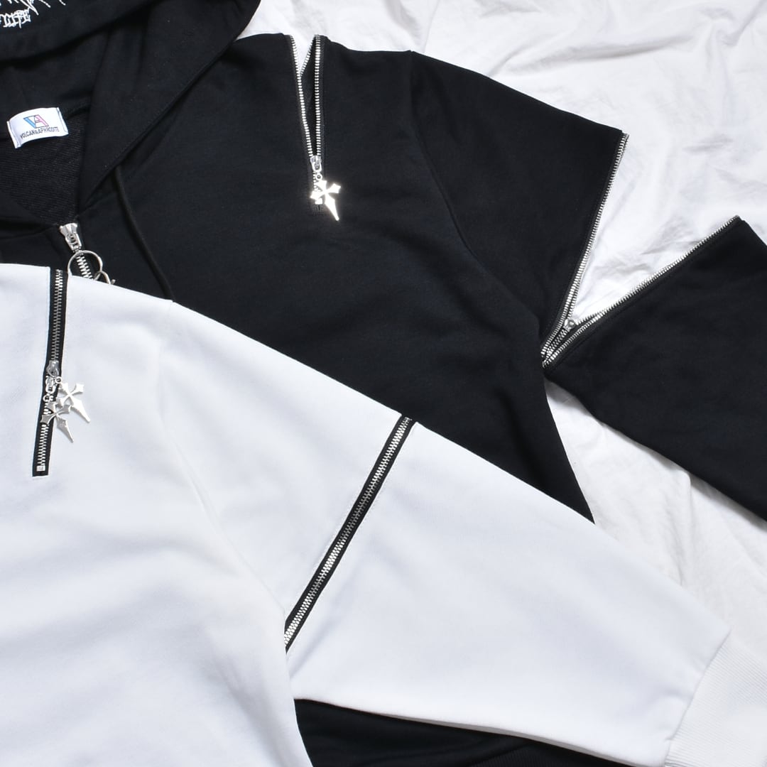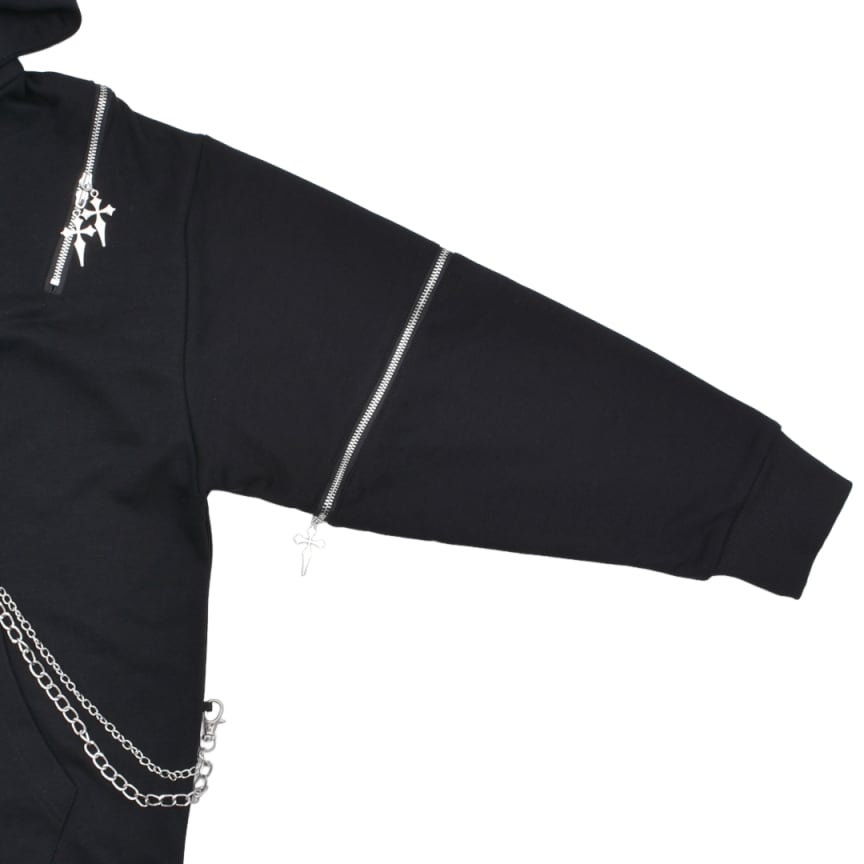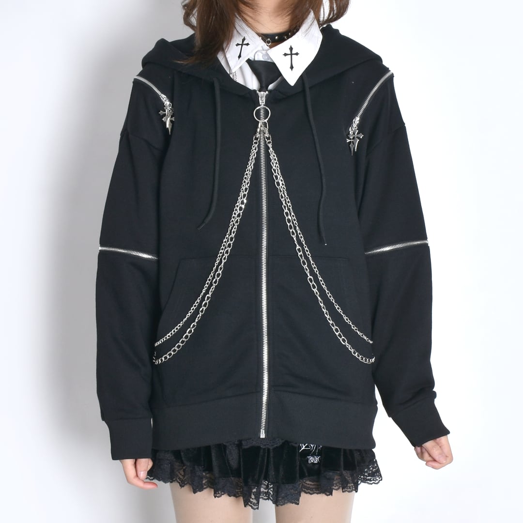 クロスモチーフのZIPファスナー、フロントの2連チェーンがアクセント