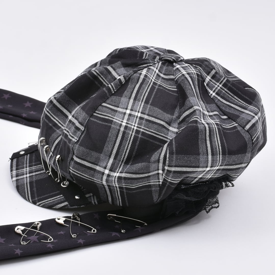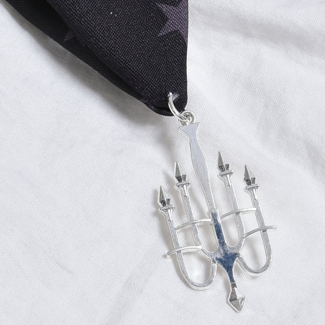 先端のメタルパーツ、ハトメベルトや安全ピンがアクセント