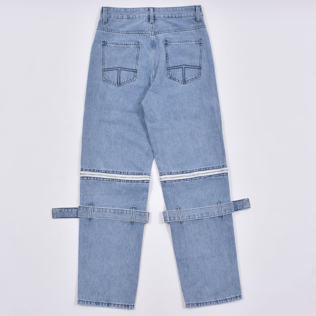 ベルトやZipでカスタムした個性あふれるデニムパンツ。