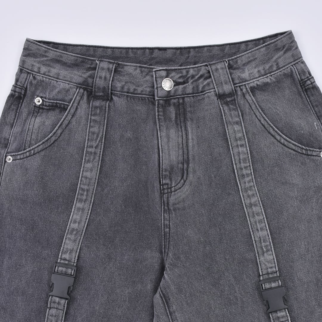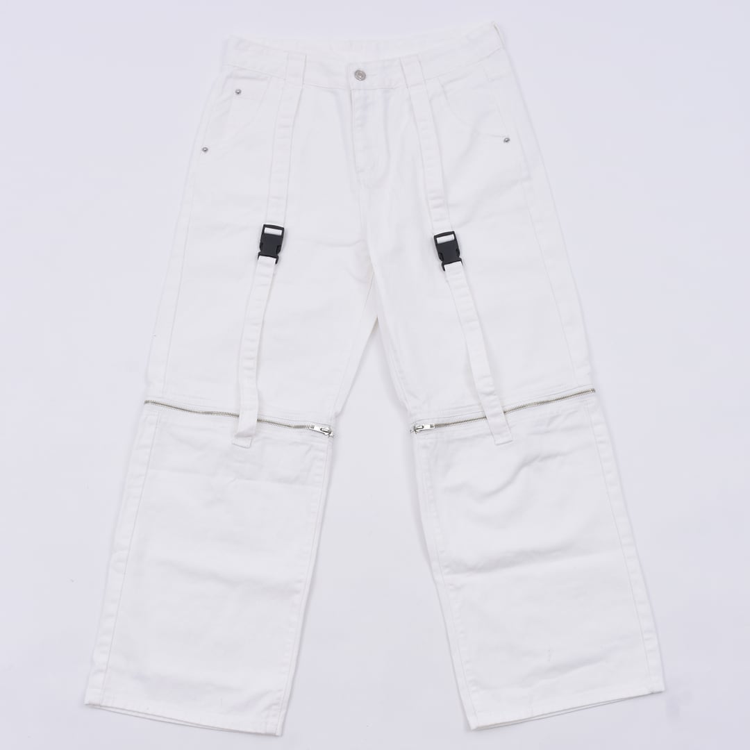 ベルトやZipでカスタムした個性あふれるデニムパンツ。