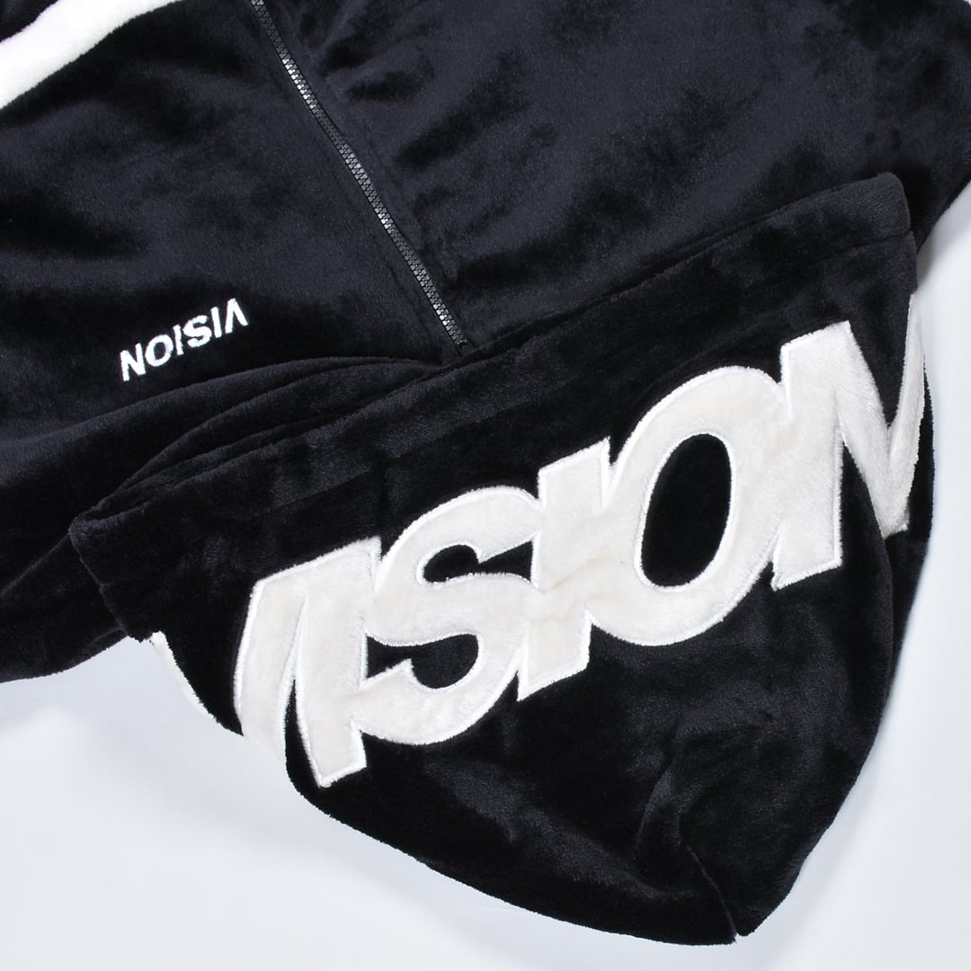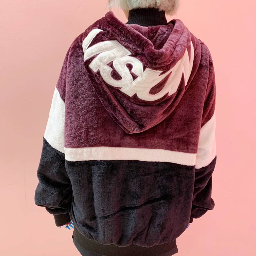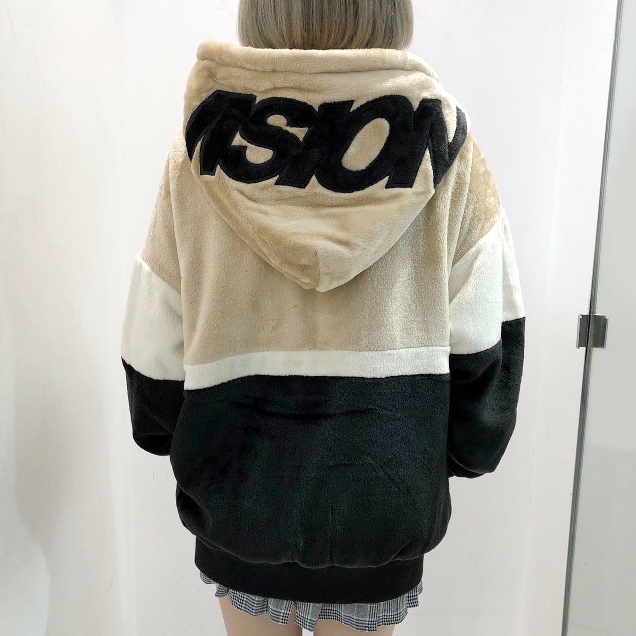大胆なカラー・柄の切り替え、フードのブランドロゴがインパクト抜群。