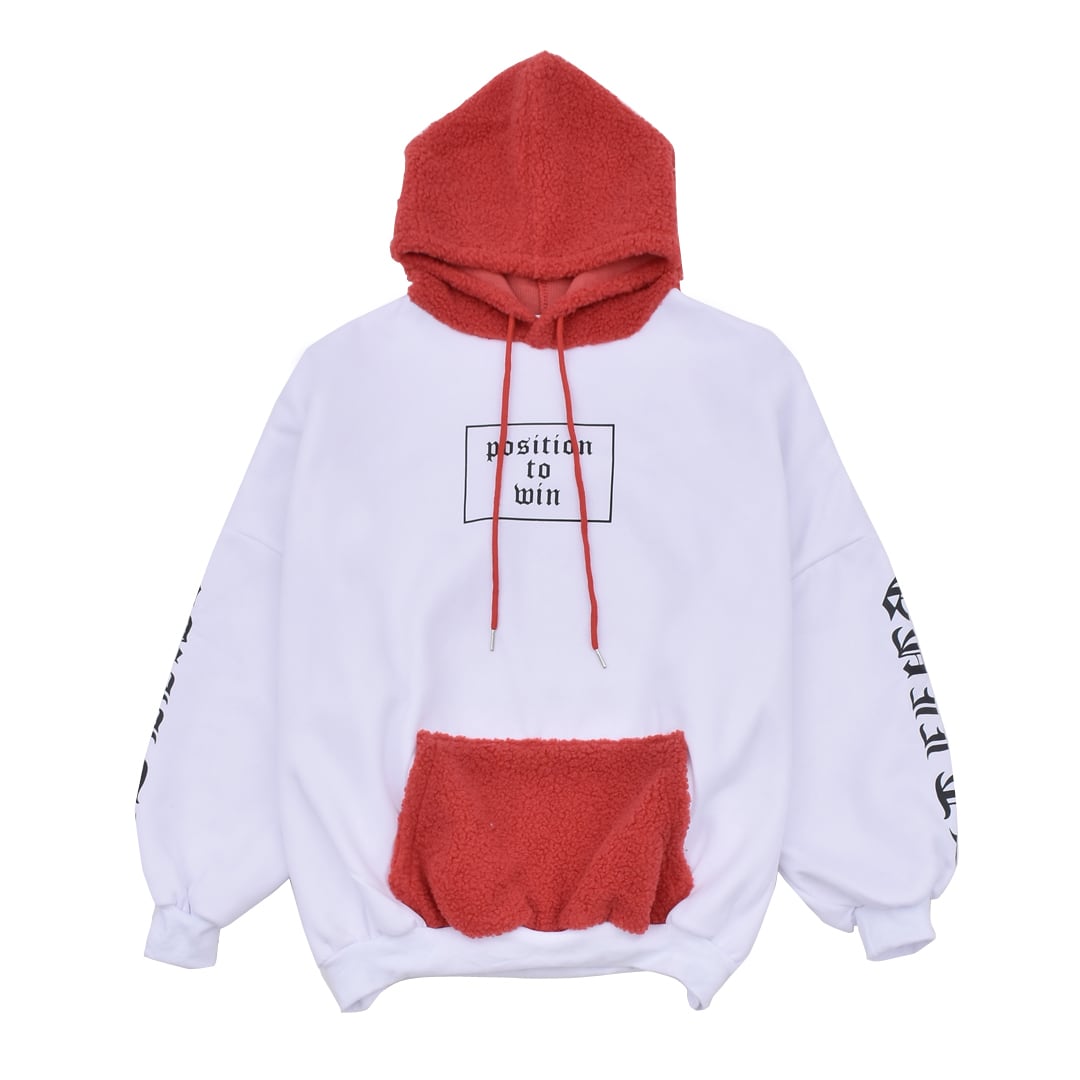 切り替えのボア、バックや袖のプリントデザインがインパクトあるパーカー。