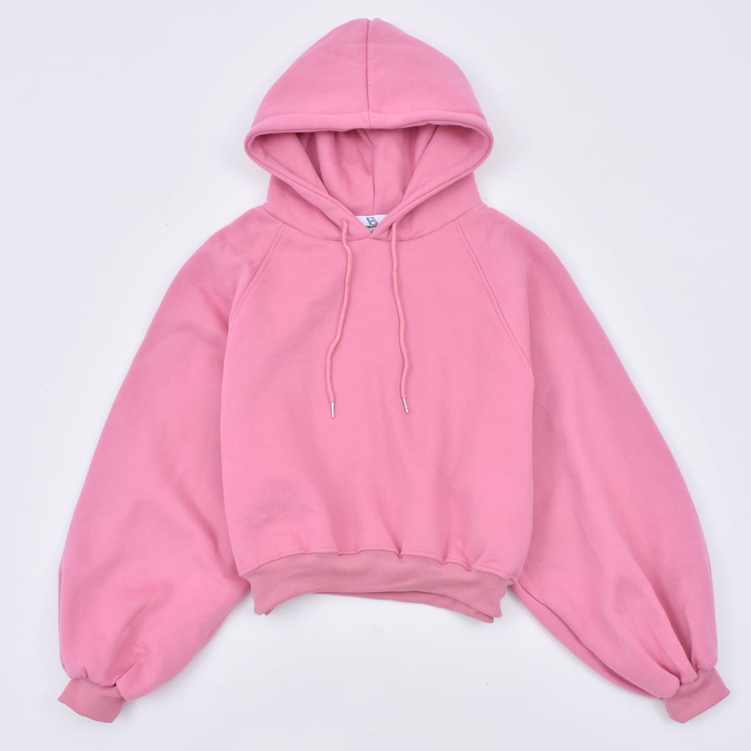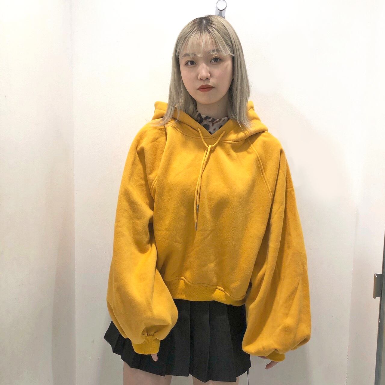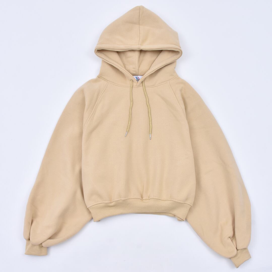 ショート丈と袖のボリューム感が、単調になりがちな無地パーカーを格上げ。
