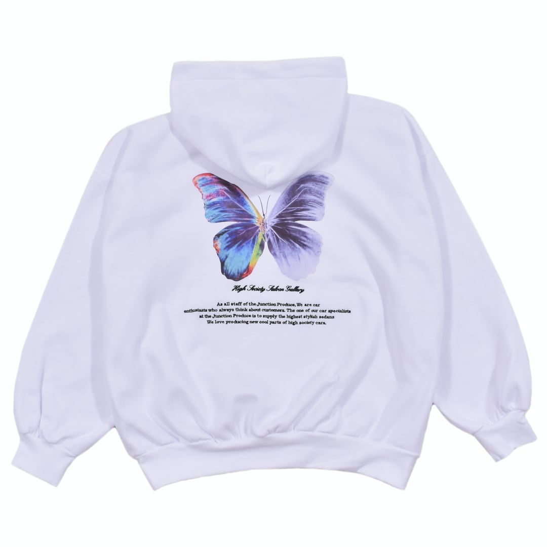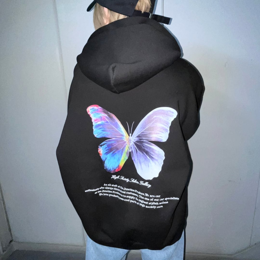 オーロラのようなバックの蝶プリントが目を惹くBIGパーカー