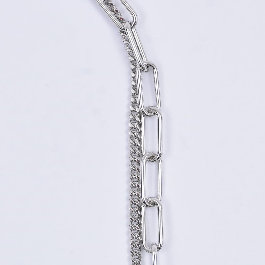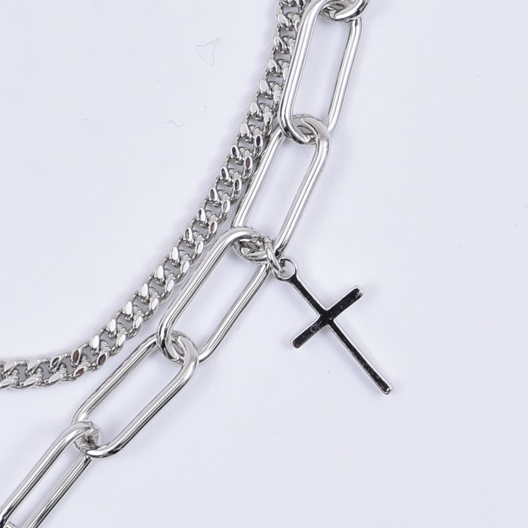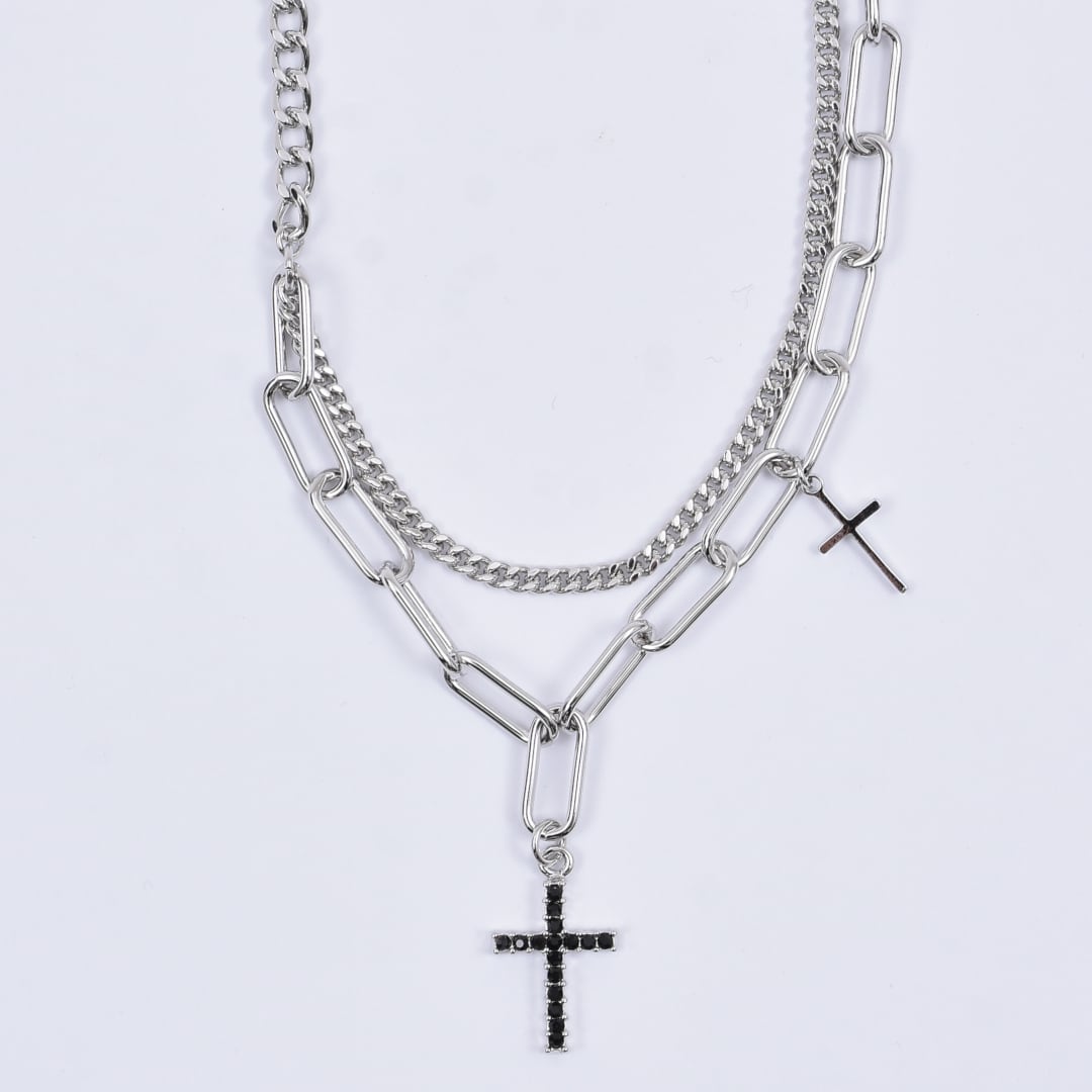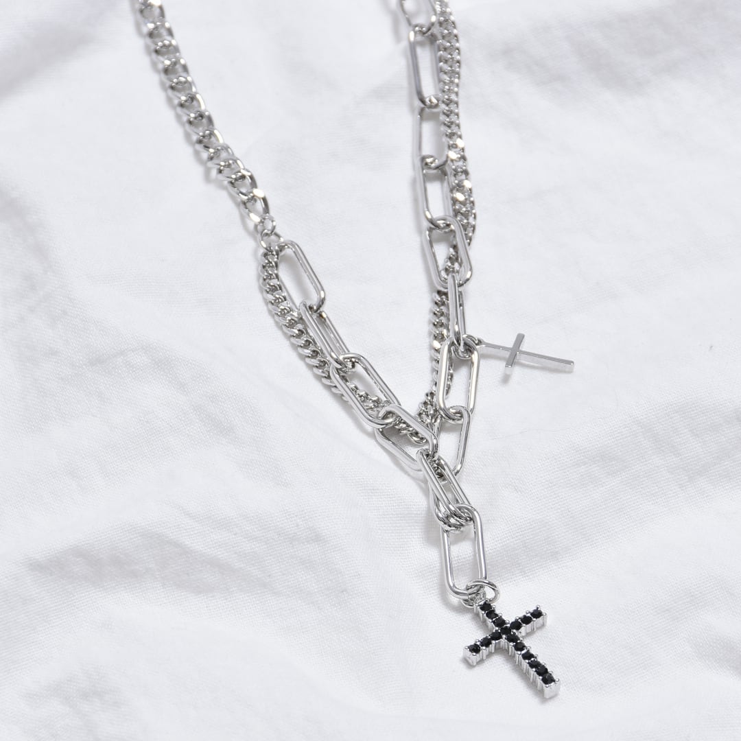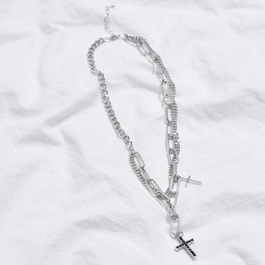 2連に連なったチェーンやクロスのチャームが印象的なネックレス