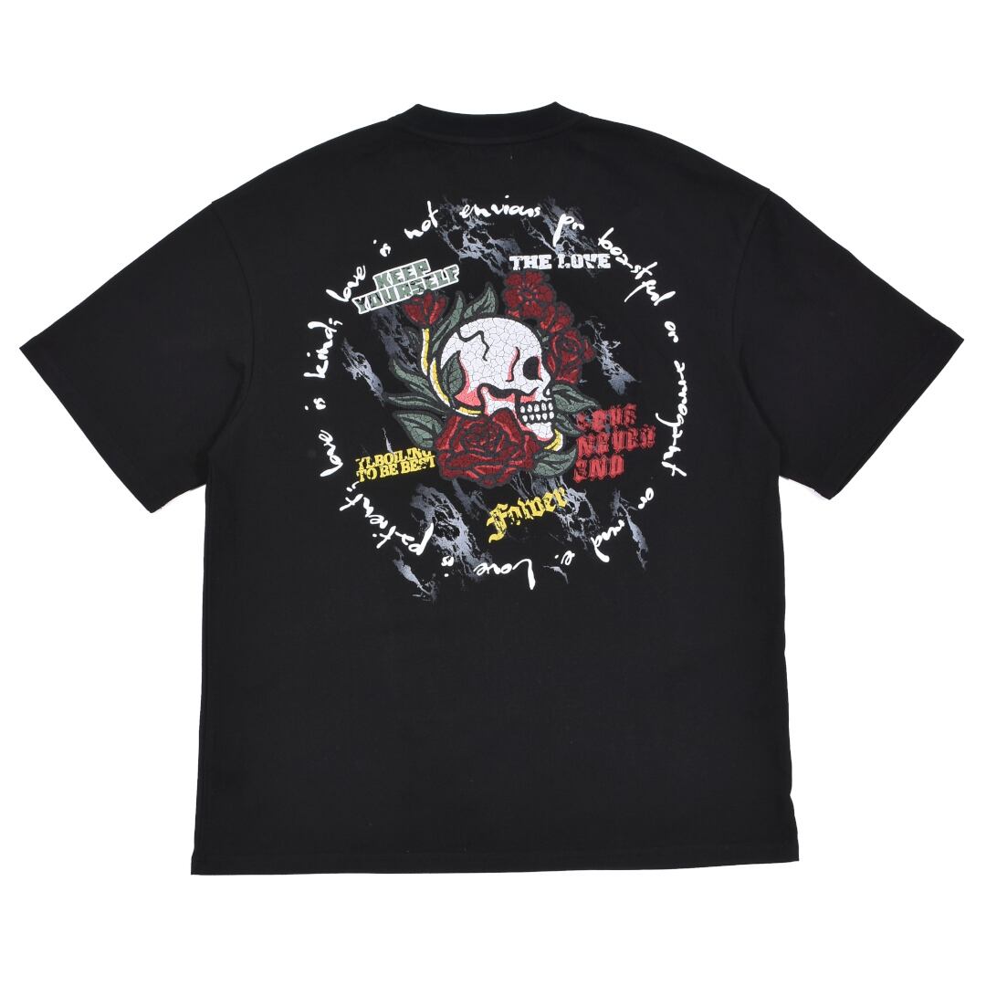 スカルや薔薇のモチーフに強めのメッセージロゴをMIXしたプリントがインパクトあるデザイン