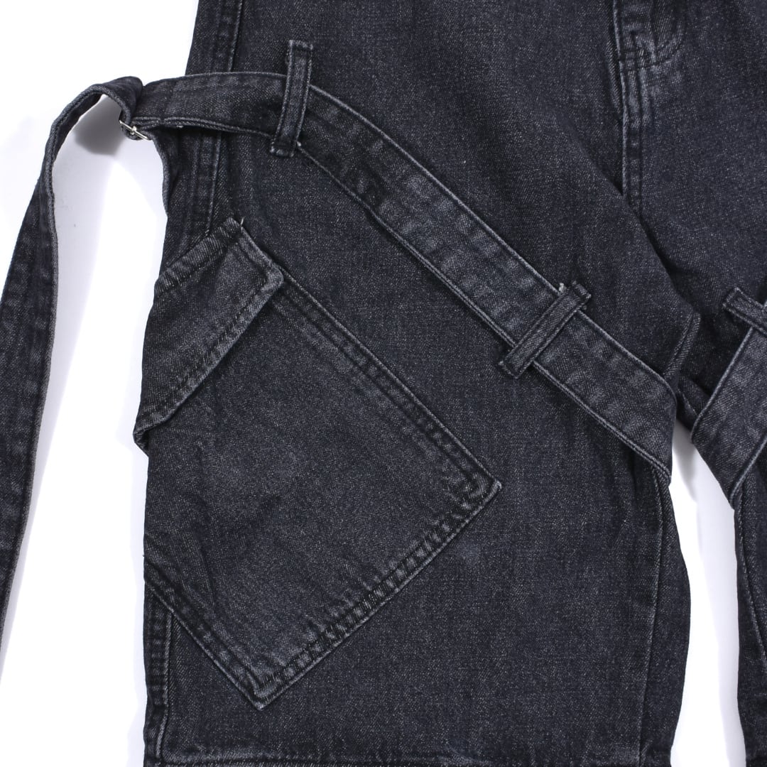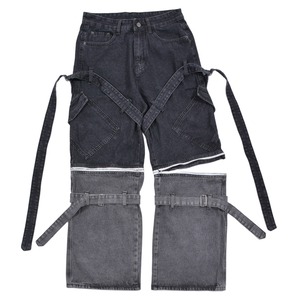 ベルトやZipでカスタムした個性あふれるデニムパンツ。