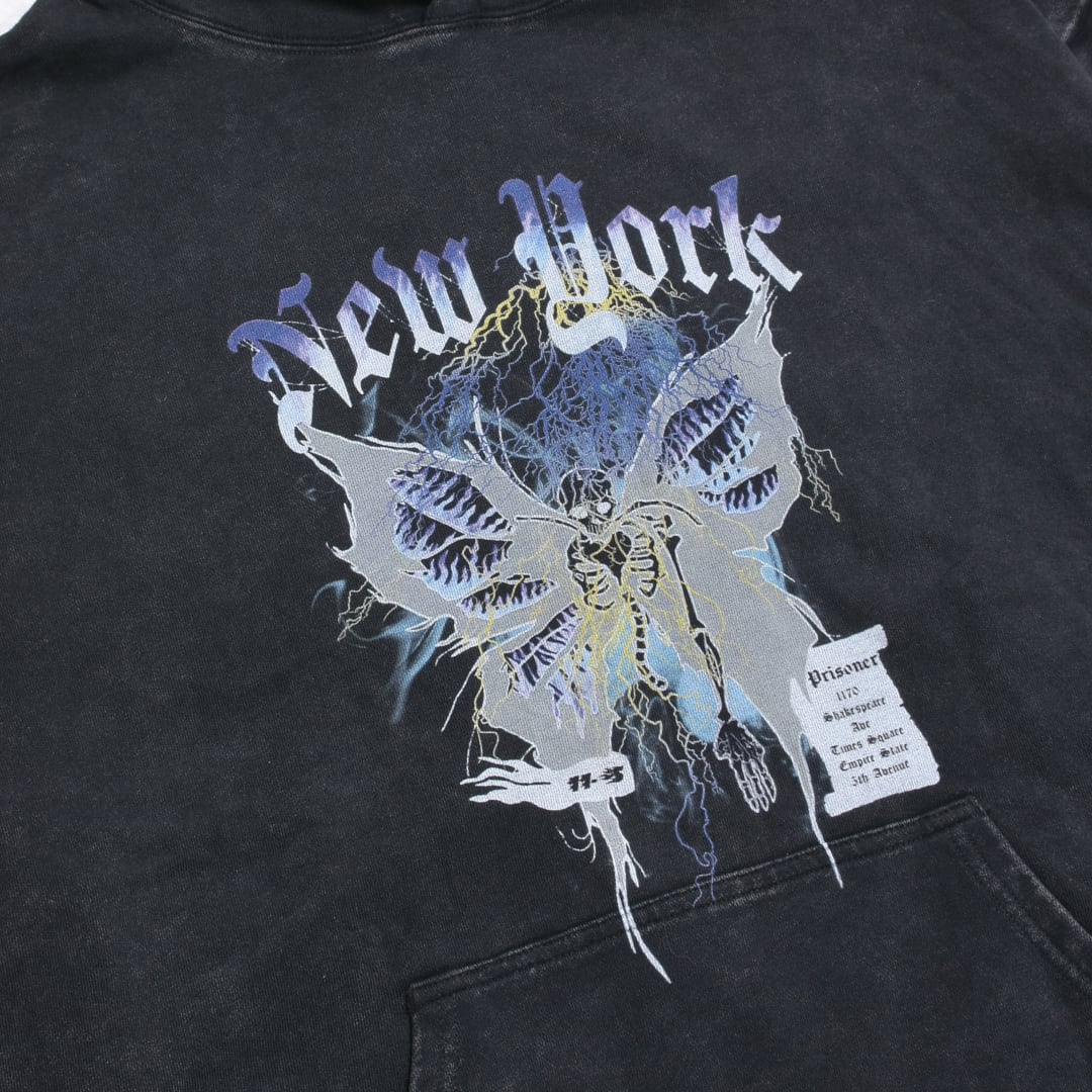 スカルと蝶がMIXしたミステリアスなプリントが印象的なパーカー