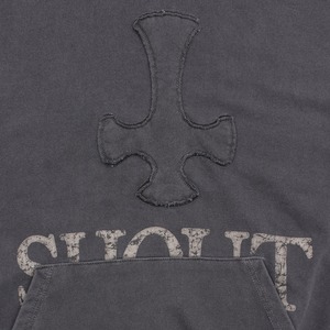 フロントの逆十字のパッチワーク、かすれたロゴデザインが印象的なパーカー