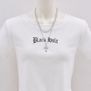 デザインの異なる2連のチェーン、クロスのチャームが印象的なネックレス