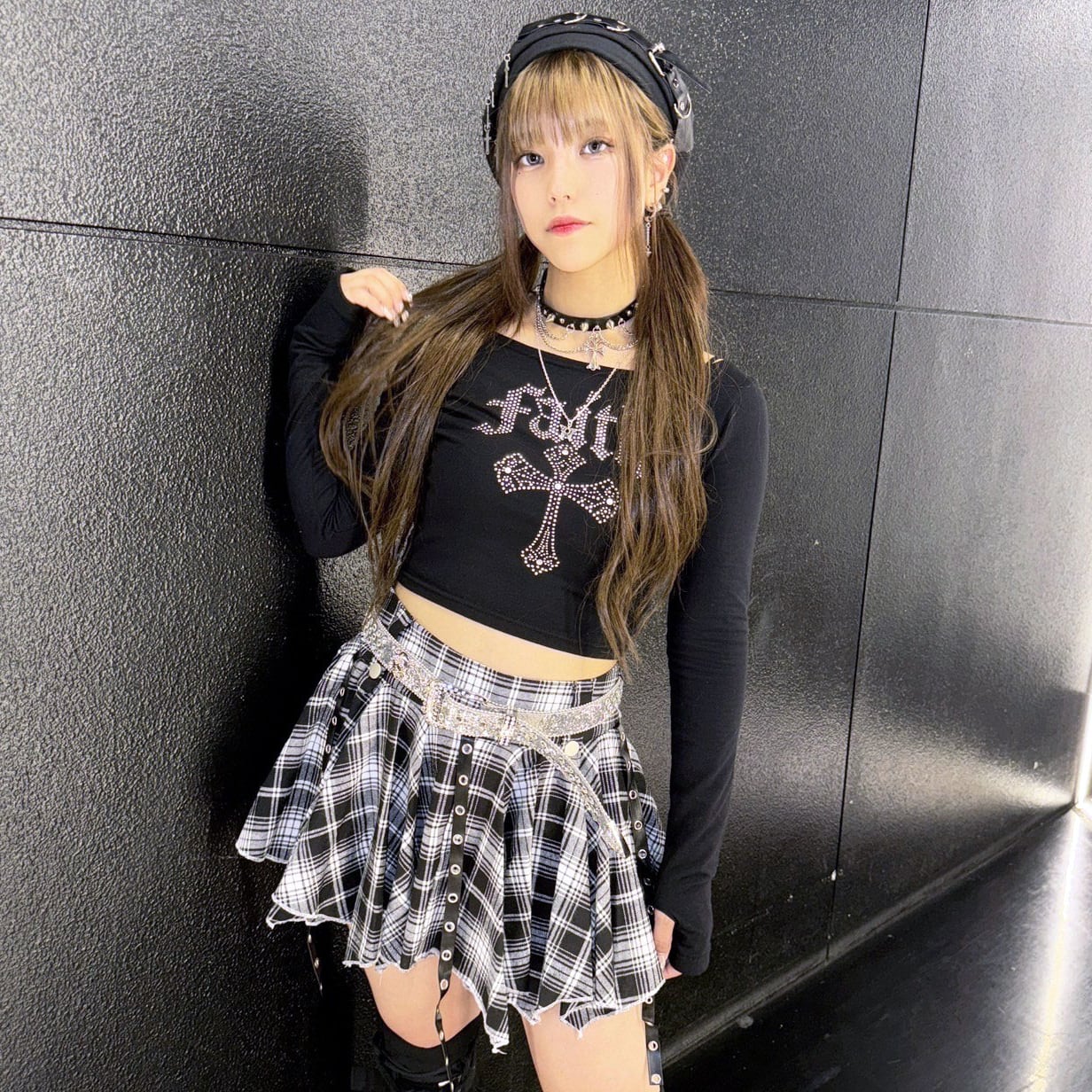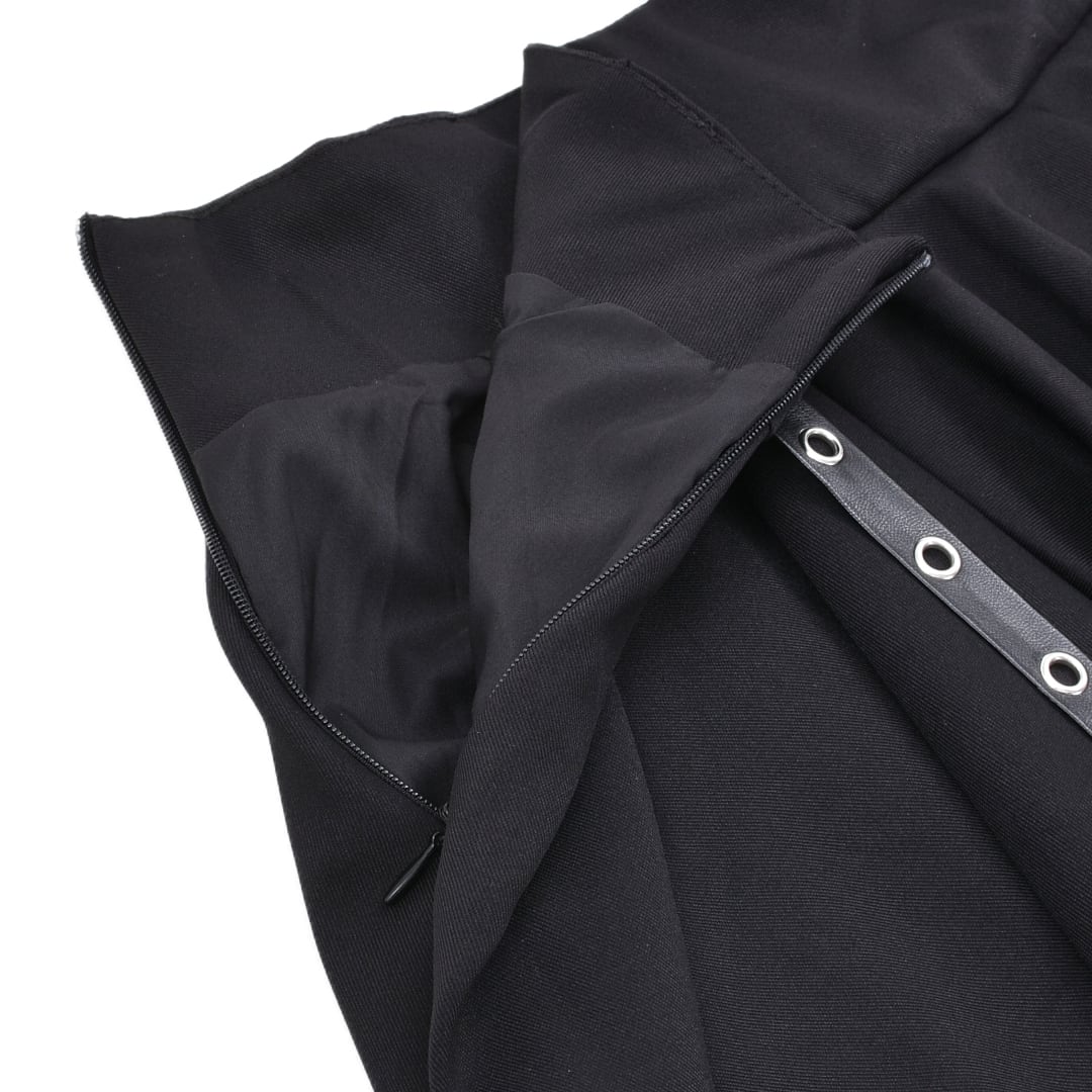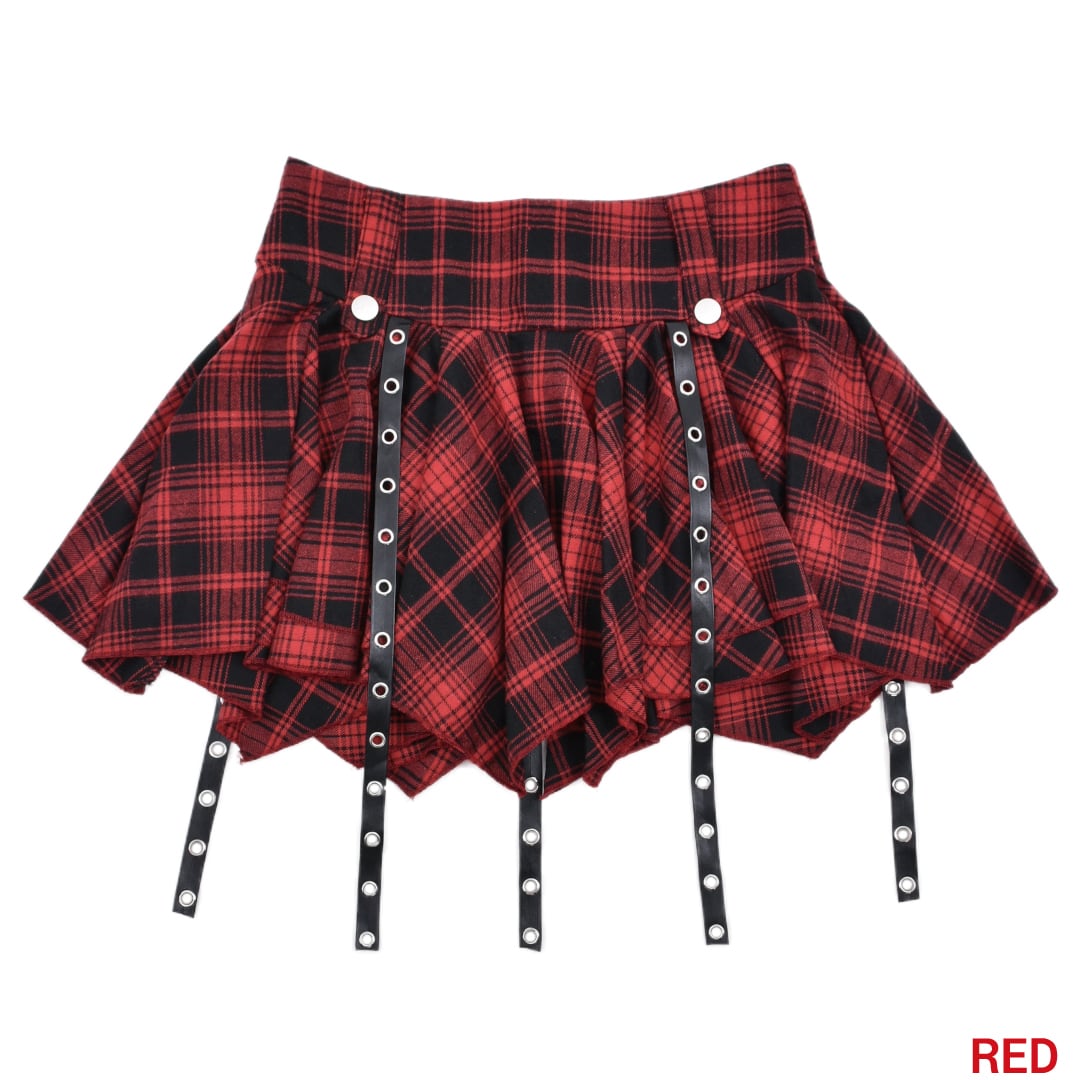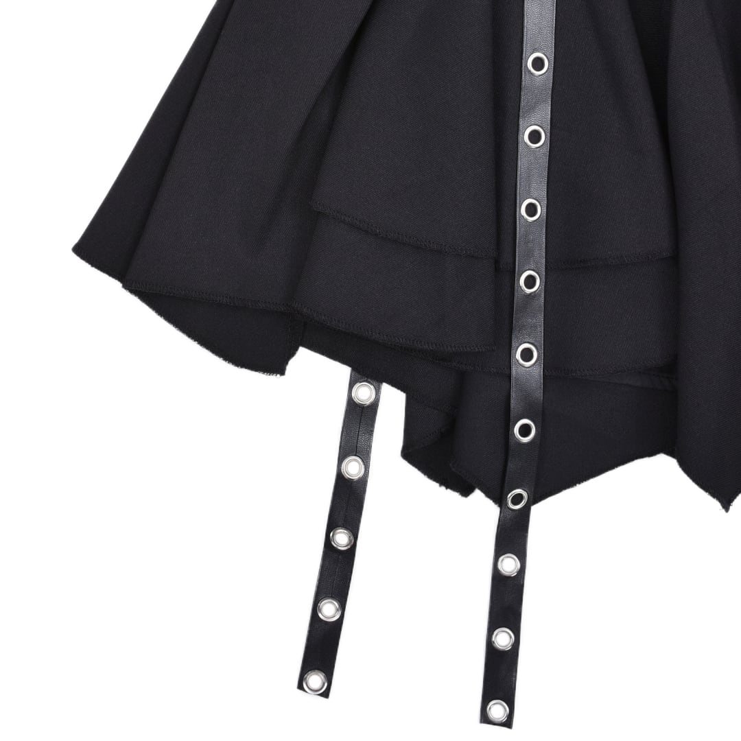 ランダムなヘムラインやハトメ付きのベルトが印象的なスカート