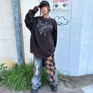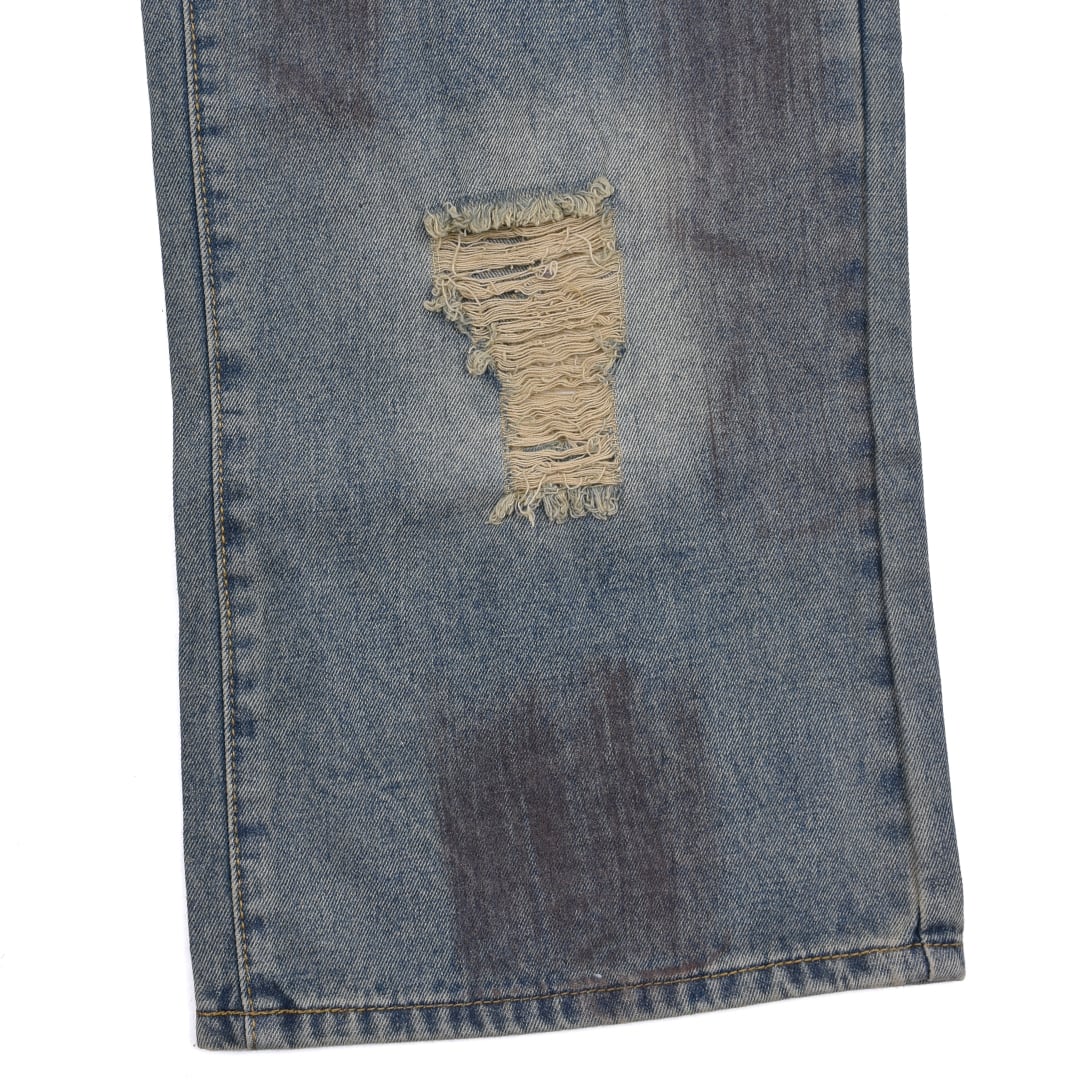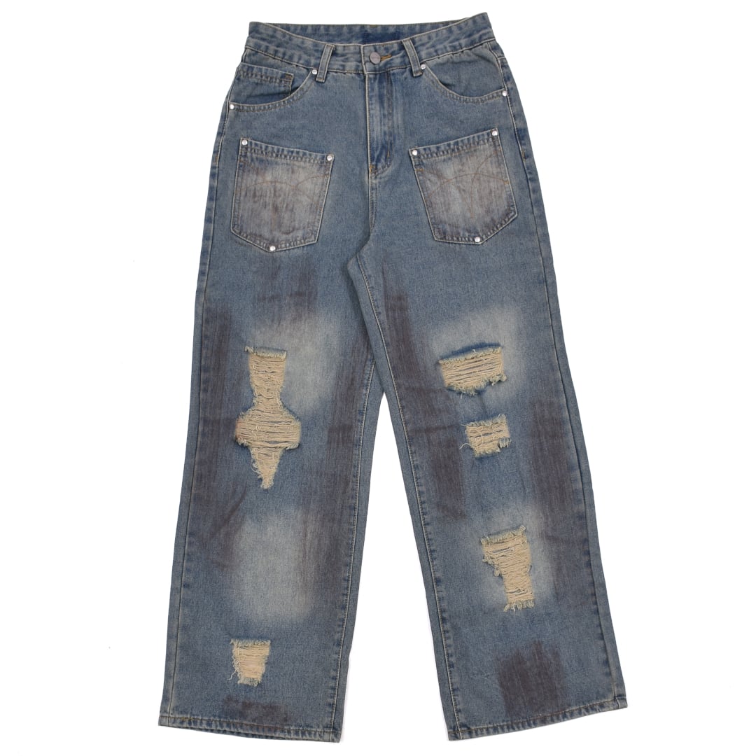 随所に施した汚れ加工やダメージ加工がインパクトあるデニムパンツ