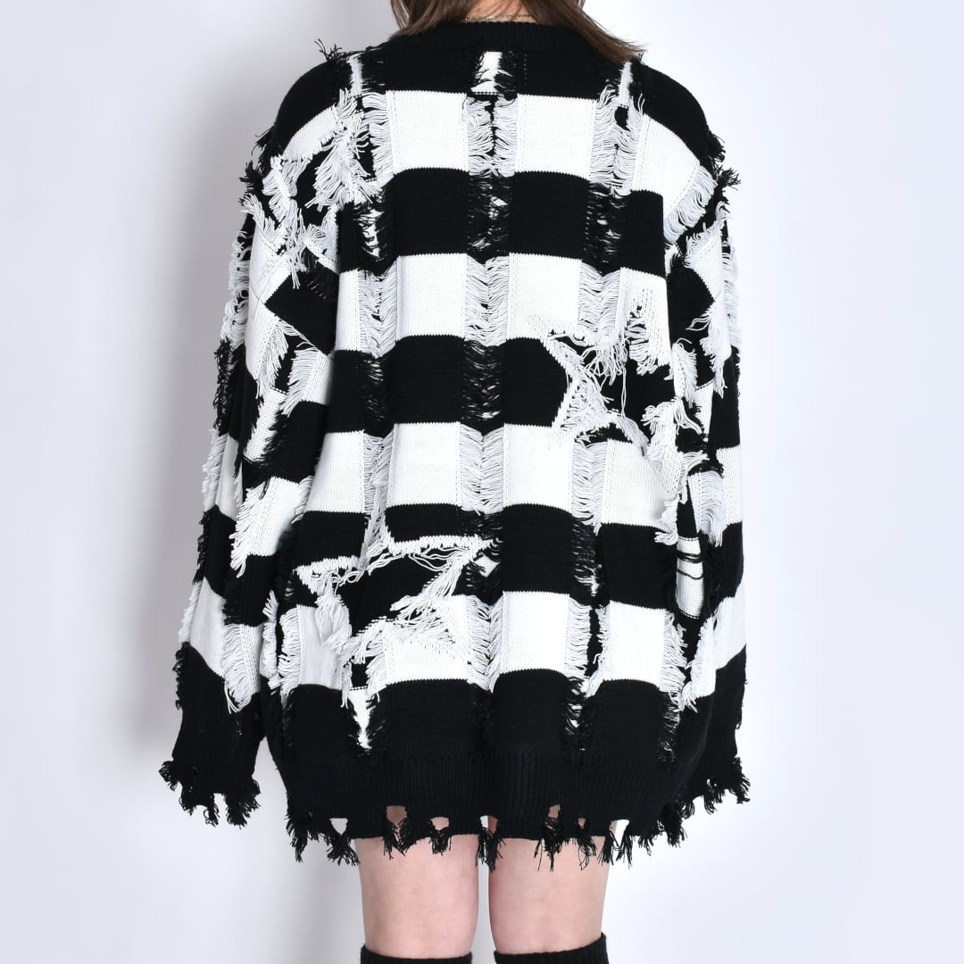 随所に施したダメージ加工、星柄のモチーフがインパクトあるニット