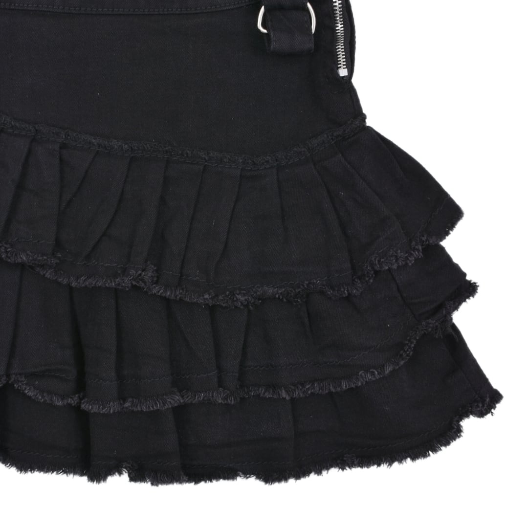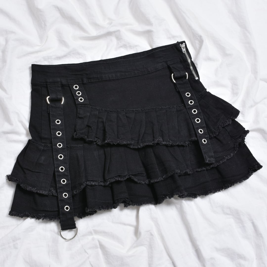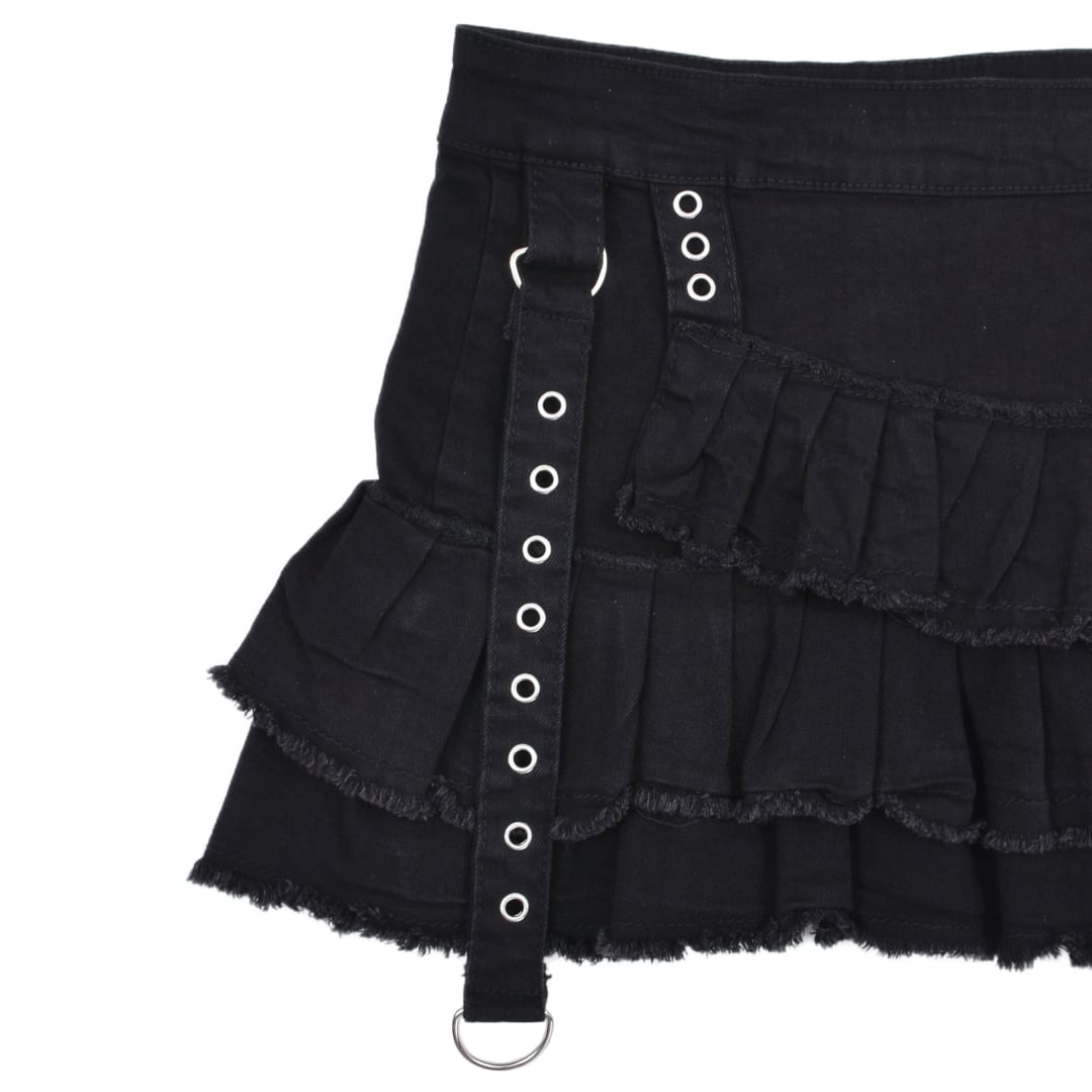 イレギュラーヘムのティアードやハトメ付きのベルトが個性的なミニスカート