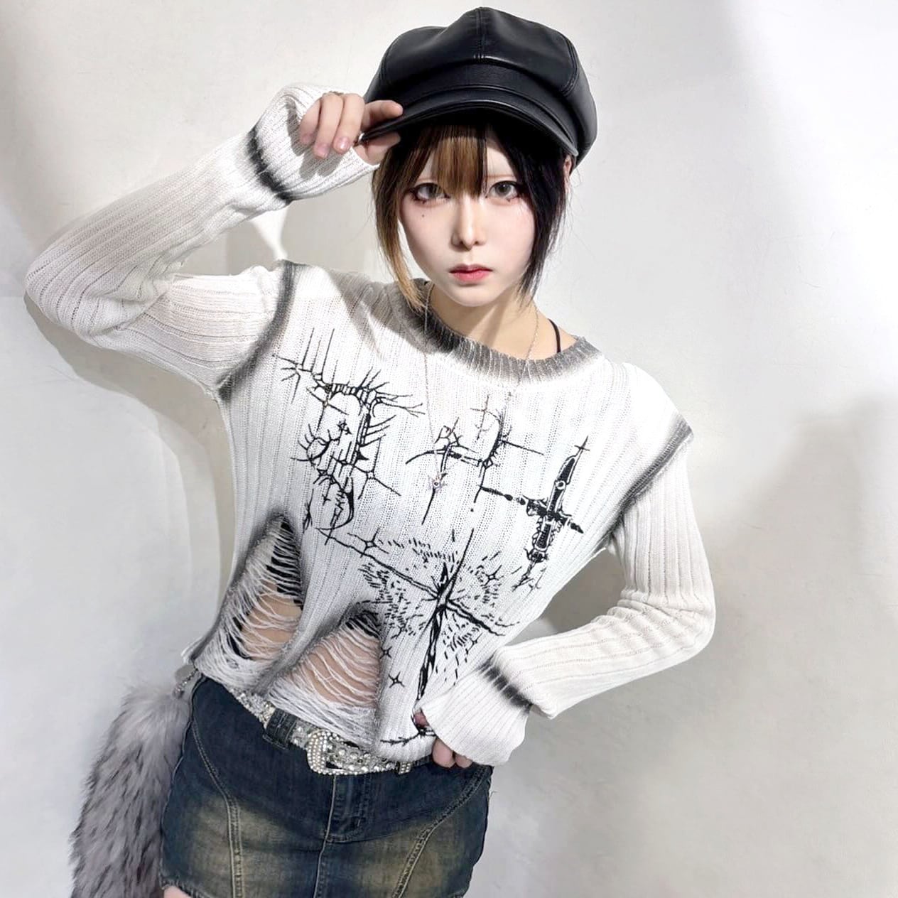 随所に施した汚れ、ダメージ加工がインパクトあるニット