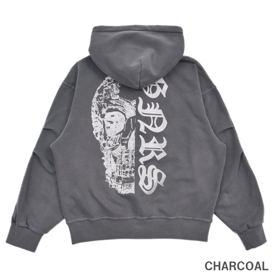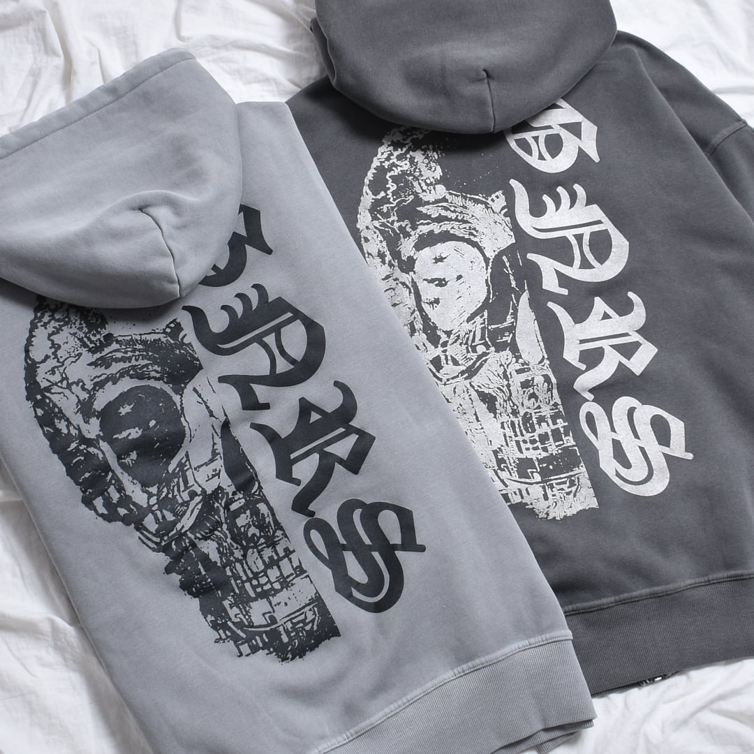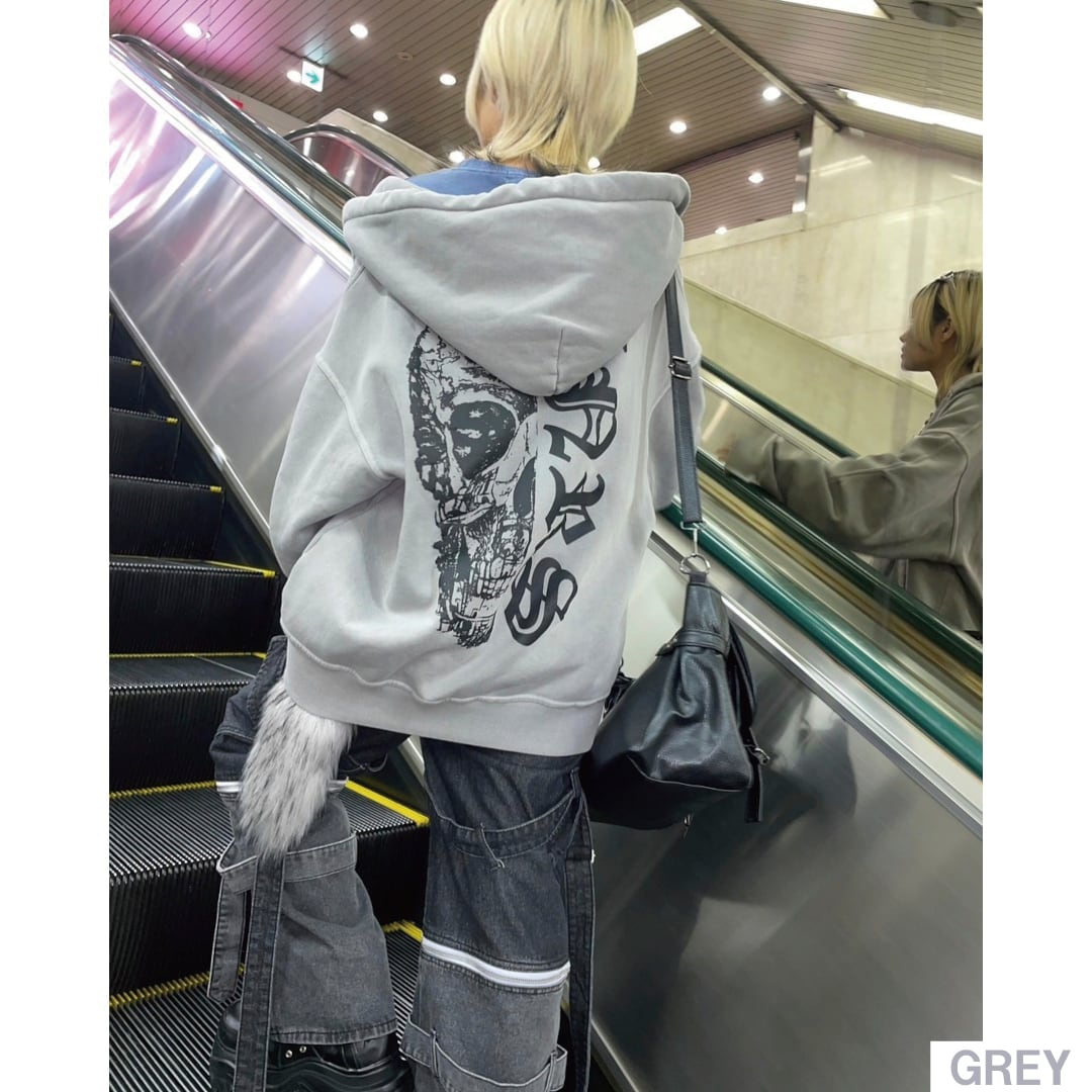 随所に施されたスカルモチーフが印象的なZIPパーカー