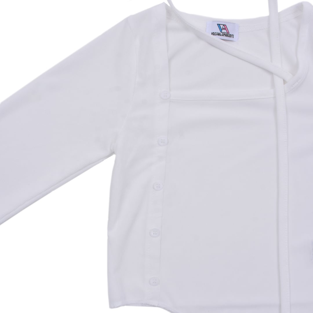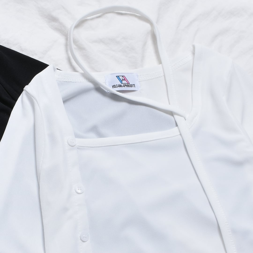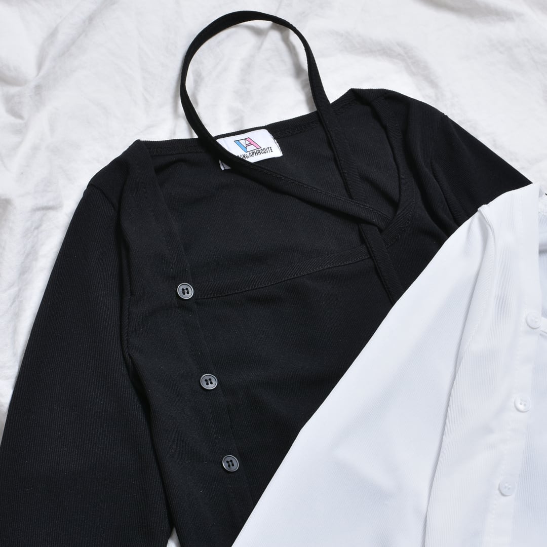首に紐を巻きつけているかのようなデザインが斬新なロンT