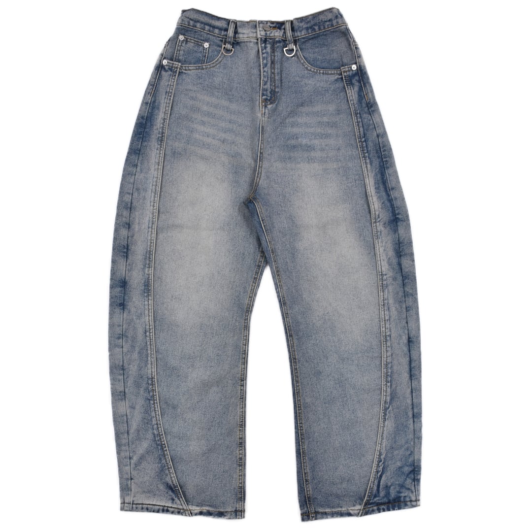 裾に向かって緩やかにすぼまっていく「バレル」シルエットを落とし込んだデニムパンツ